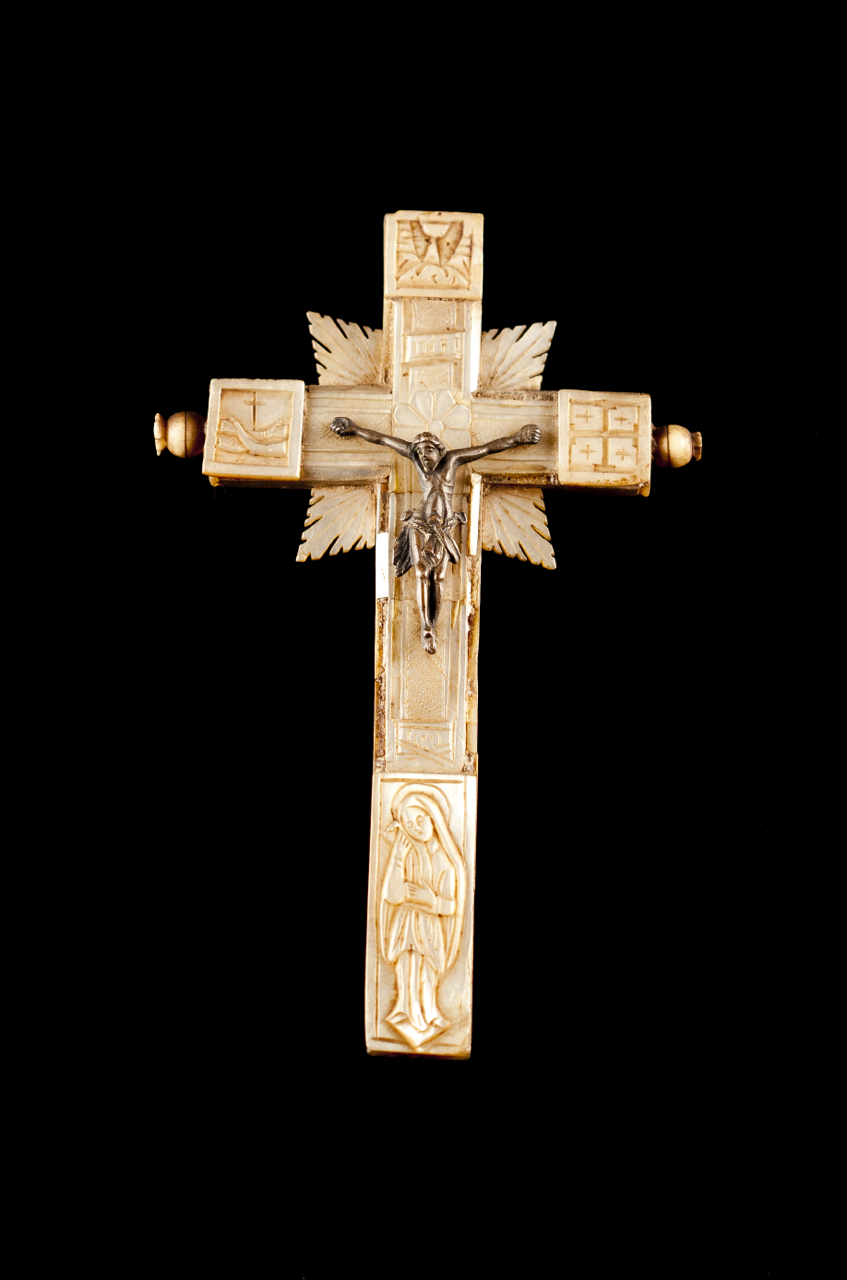 A 19th century mother-of-pearl inlaid olivewood cross with silver Christ