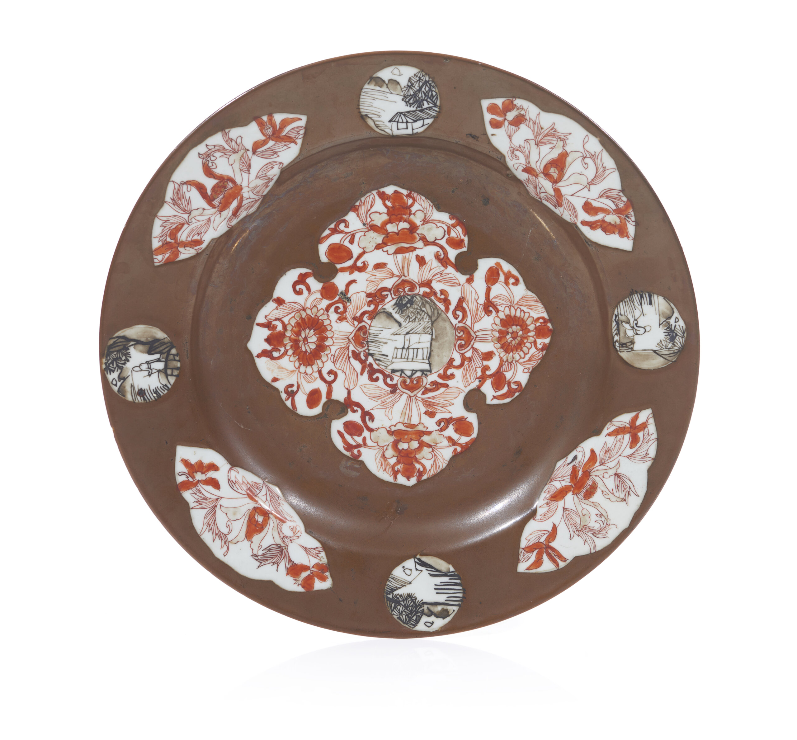 Batavian brown enamel decoration, with a circular central medallion depicting a landscape with a pavilion, surrounded by flowering peony and chrysanthemum branches in rouge-de-fer