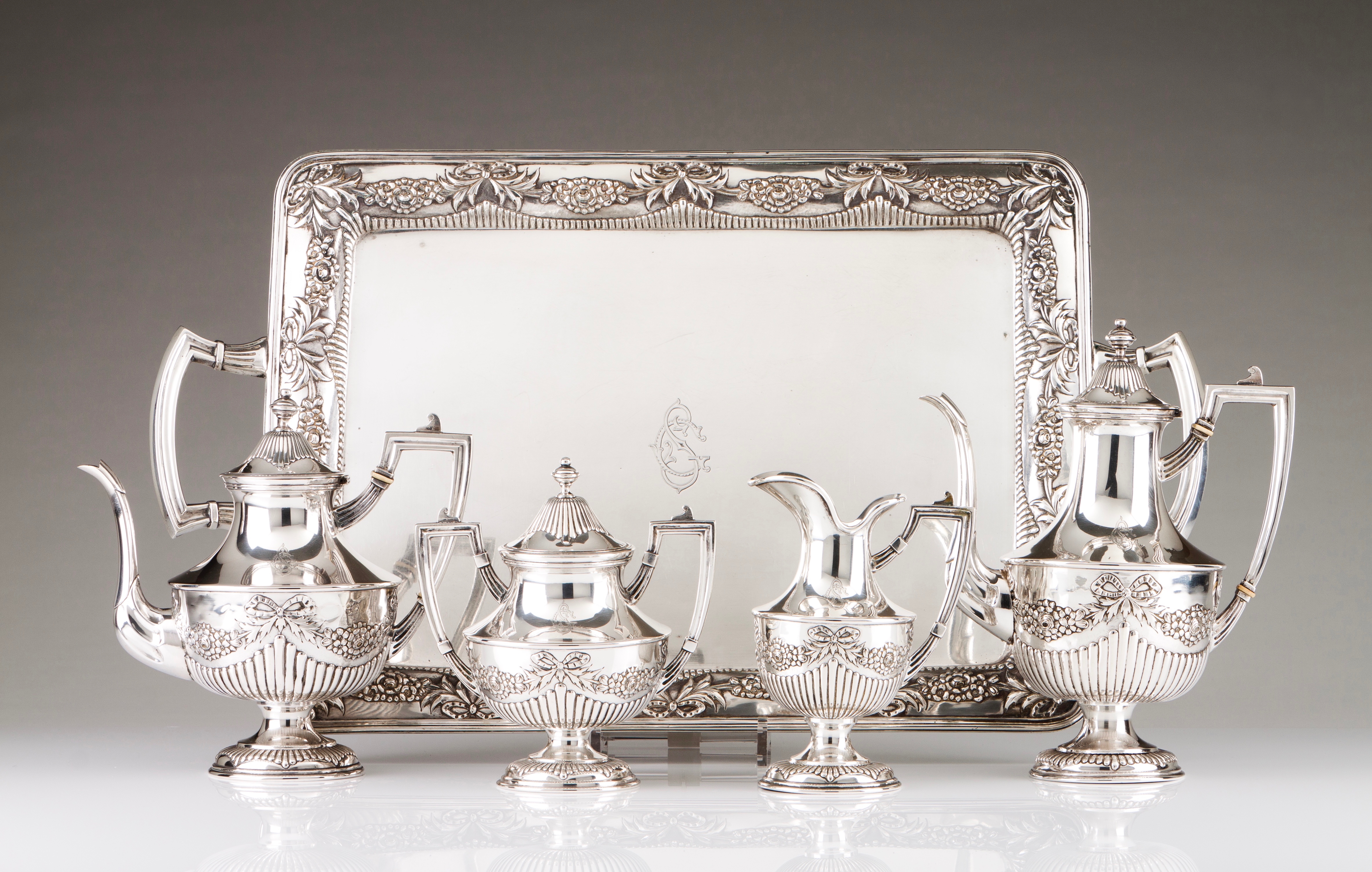 Comprising: a tray with two handles, a teapot, a coffee pot, a milk jug and a sugar bowl with cover