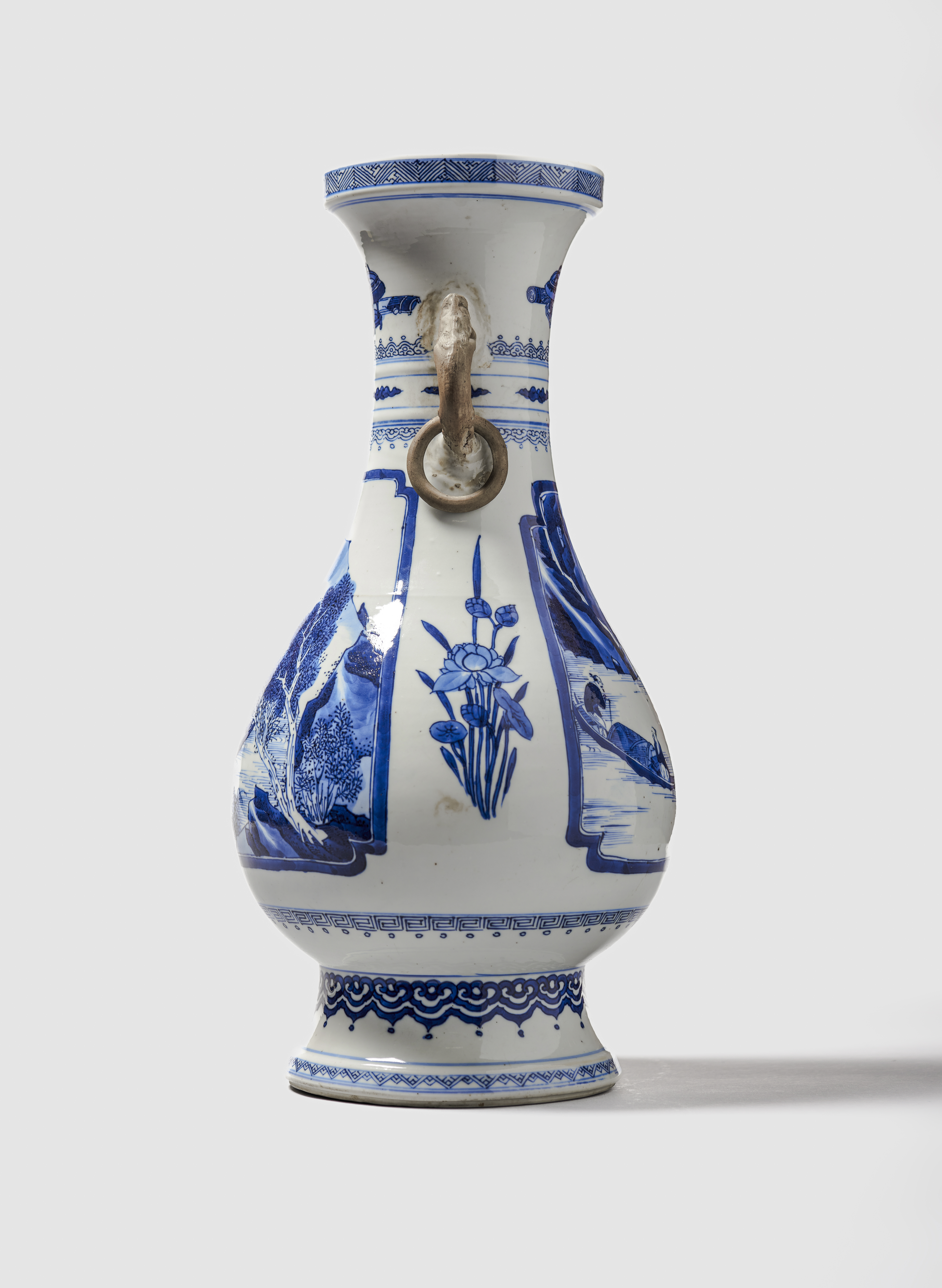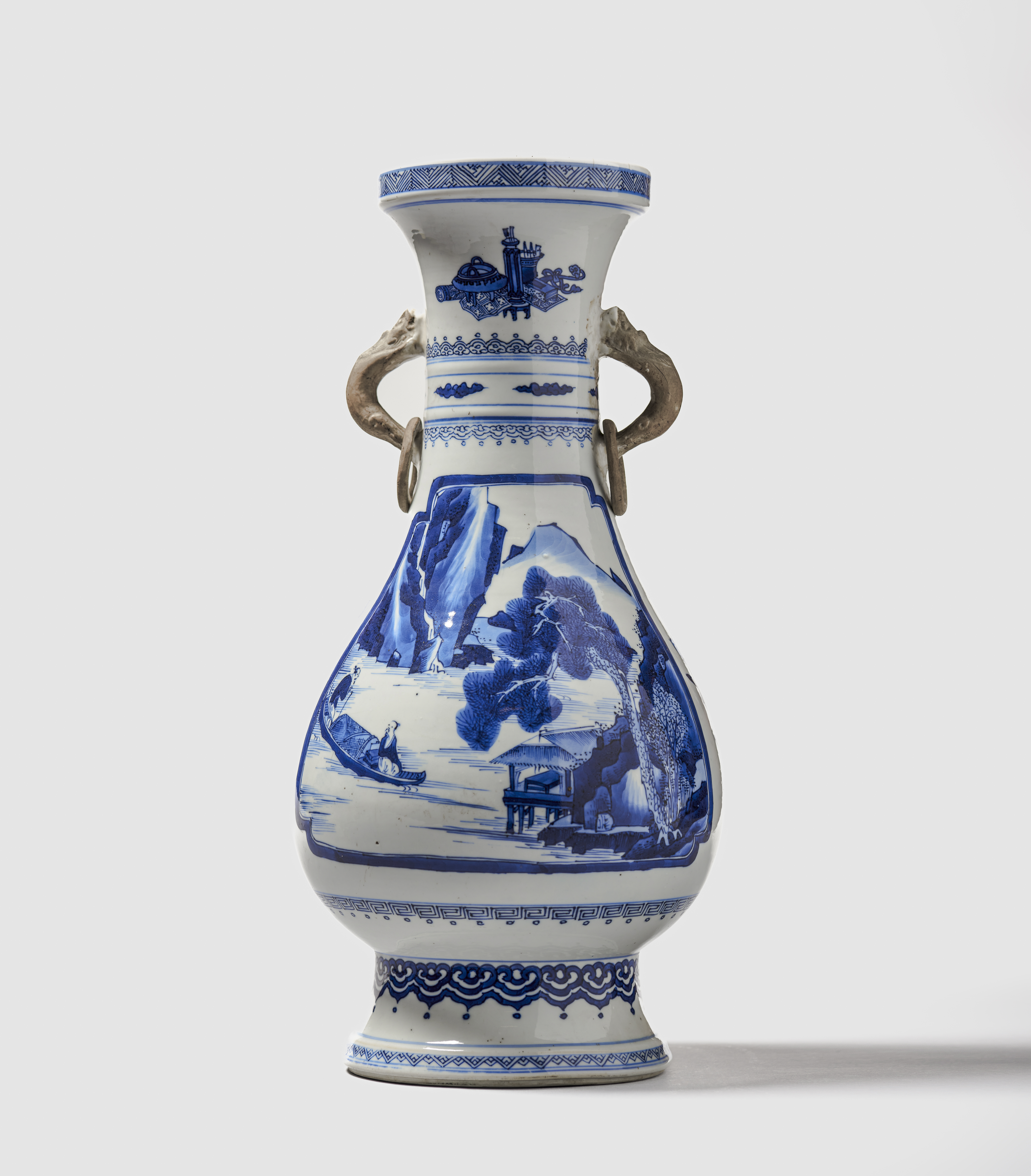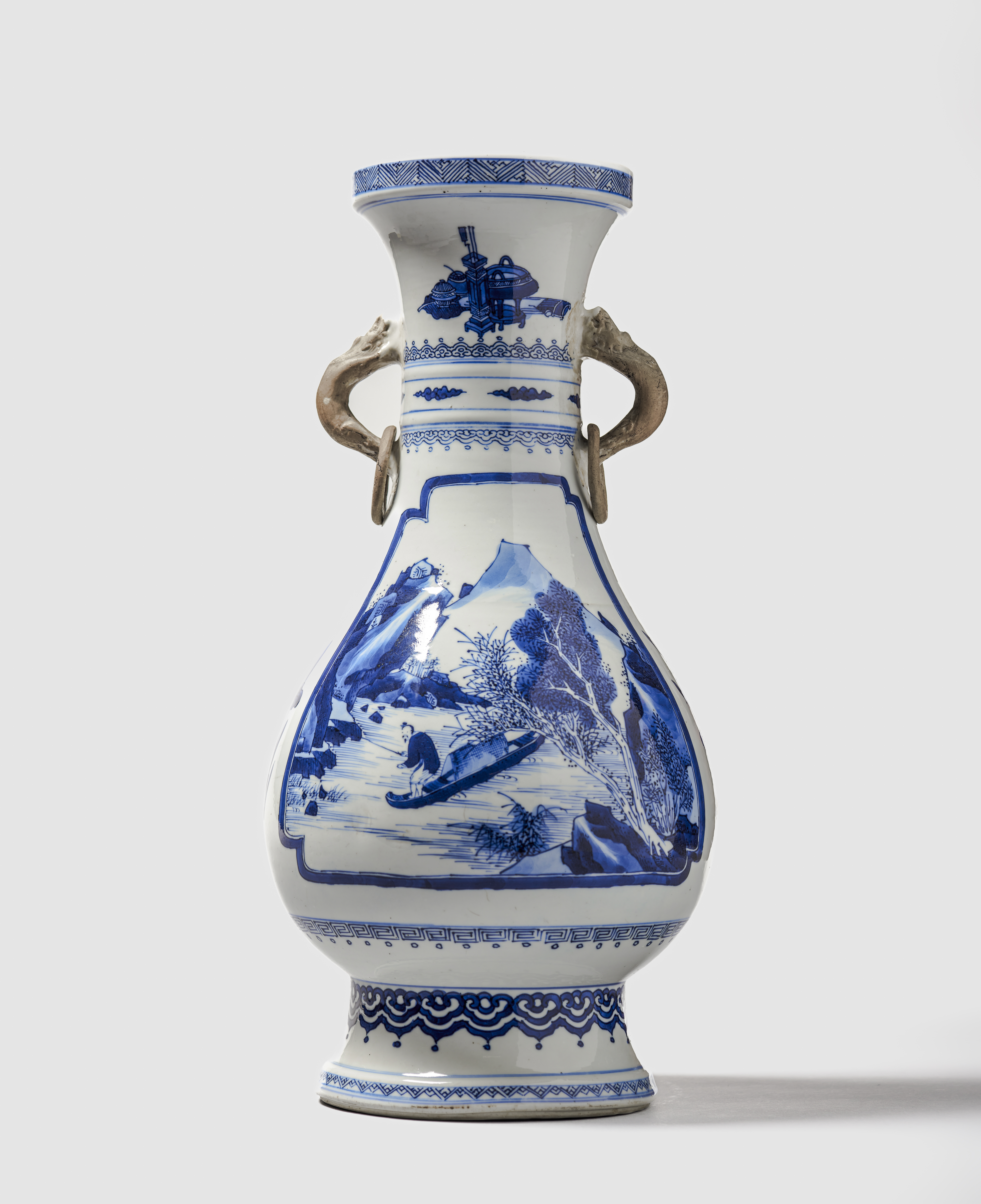 With two dragon loop handles, each with a loose ring, and left in the biscuit. Painted in vibrant shades of cobalt blue and decorated on the body with two panels alternating with lotus sprays. Each panel featuring a scene with fishermen on a river and a mountainous landscape in the background. The neck is decorated with 'Antiques' and the foot is encircled with a ruyi border.