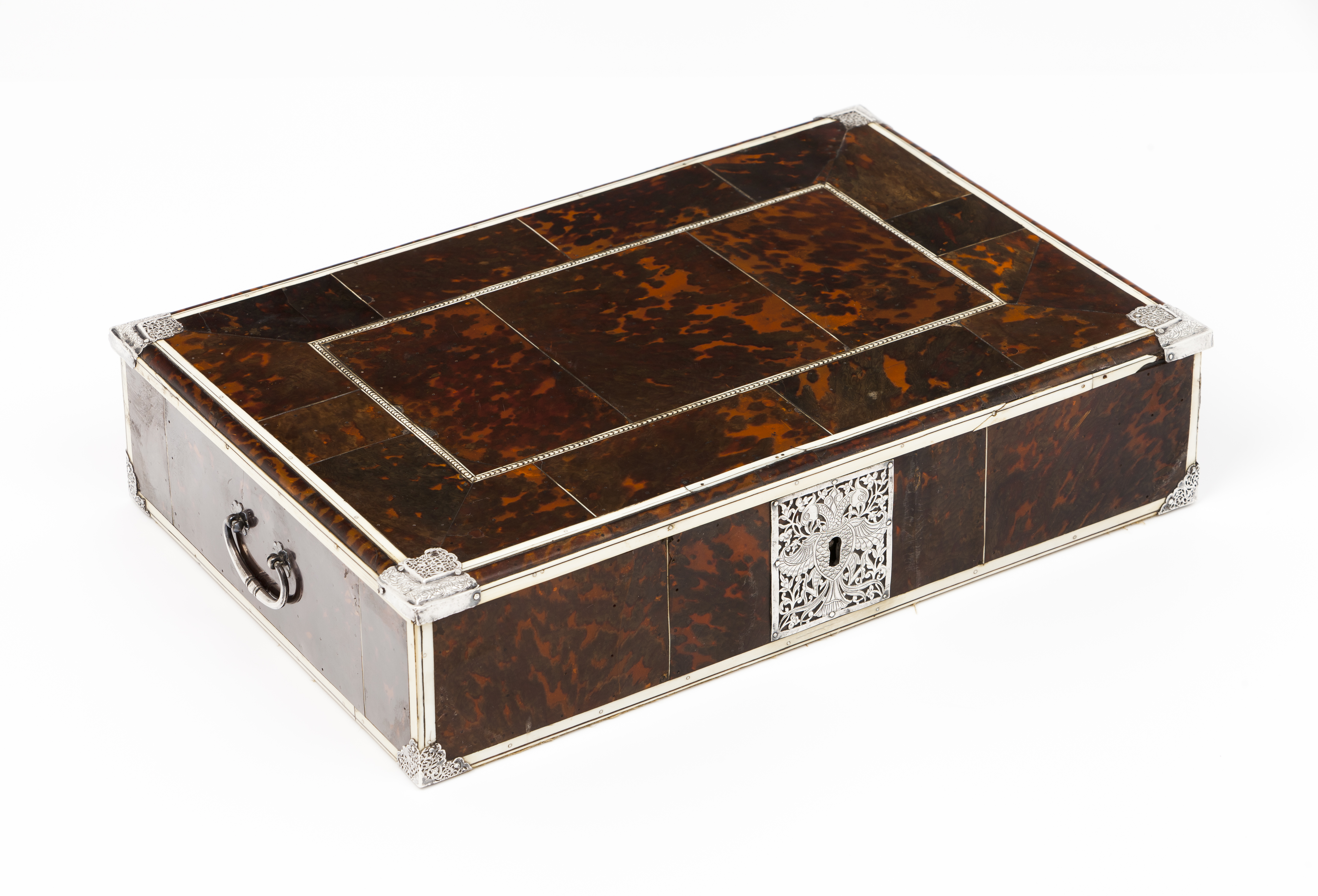 Wooden carcass coated in tortoiseshell with engraved ivory friezes