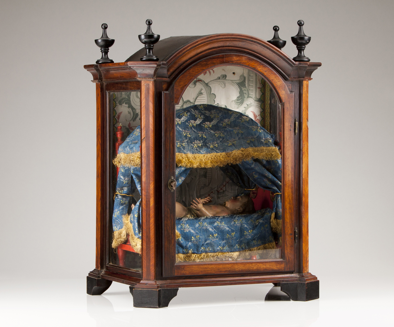 The 18th century carved, gilt and polychrome wood Child Jesus with painted wood and silk bed