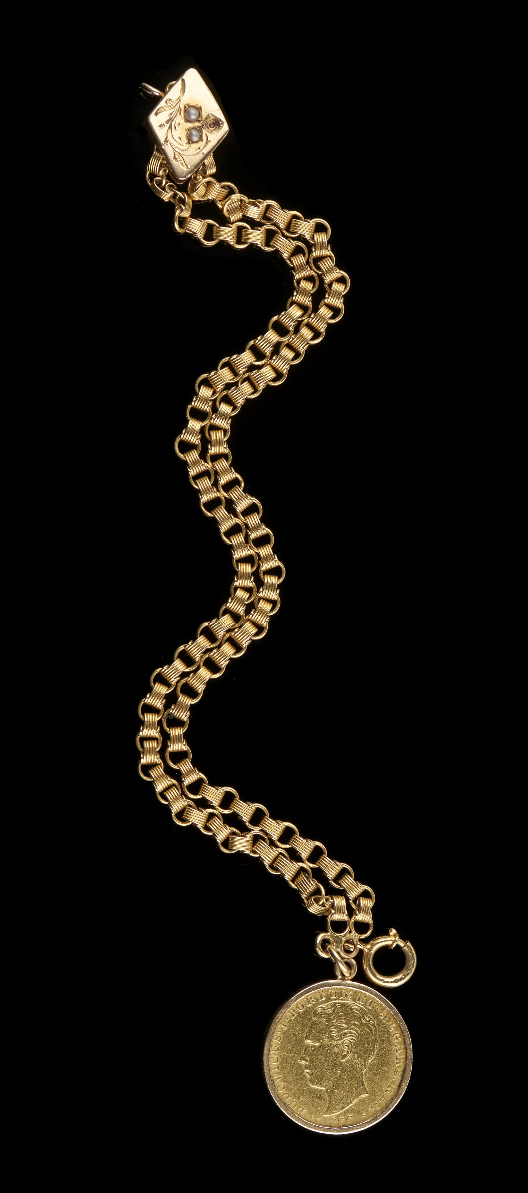 Cross bar set with demi pearls and gold 2000 reales coin dated 1866 - King Luís I