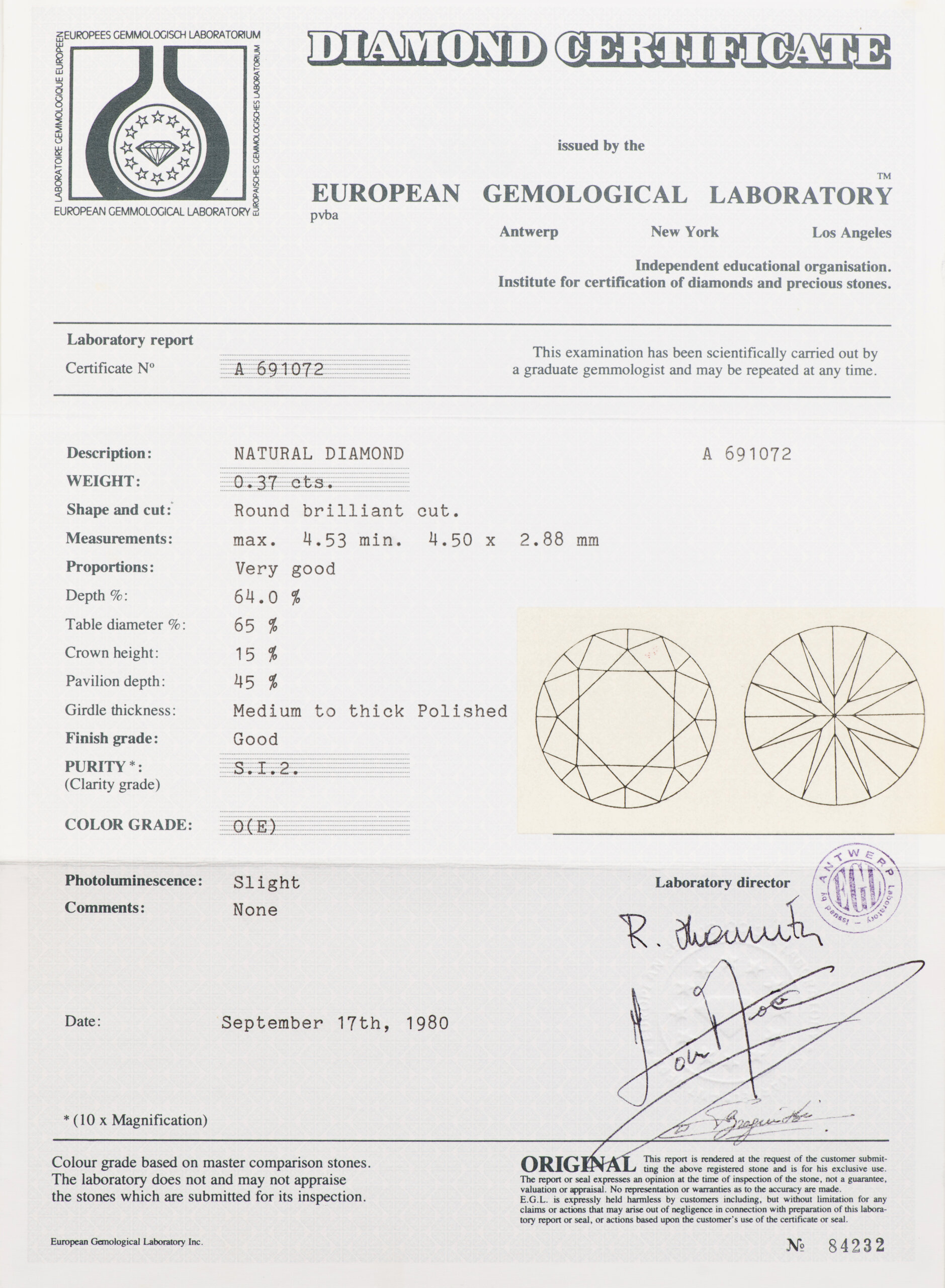 Brilliant-cut diamond weighing 0.37 ct. (4.53~4.50x2.88 mm)