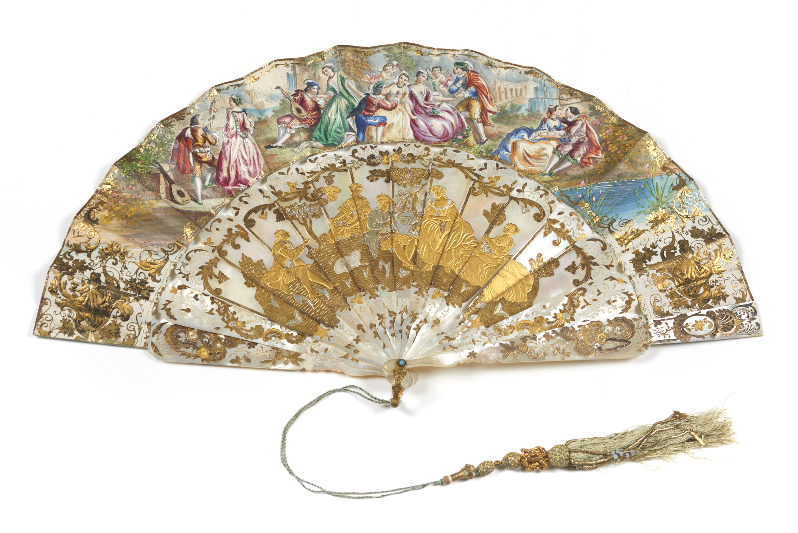 Mounted on mother-of-pearl sticks with openwork and engraved decoration, with gilt applications depicting landscape with figures and Neoclassical decorative elements
