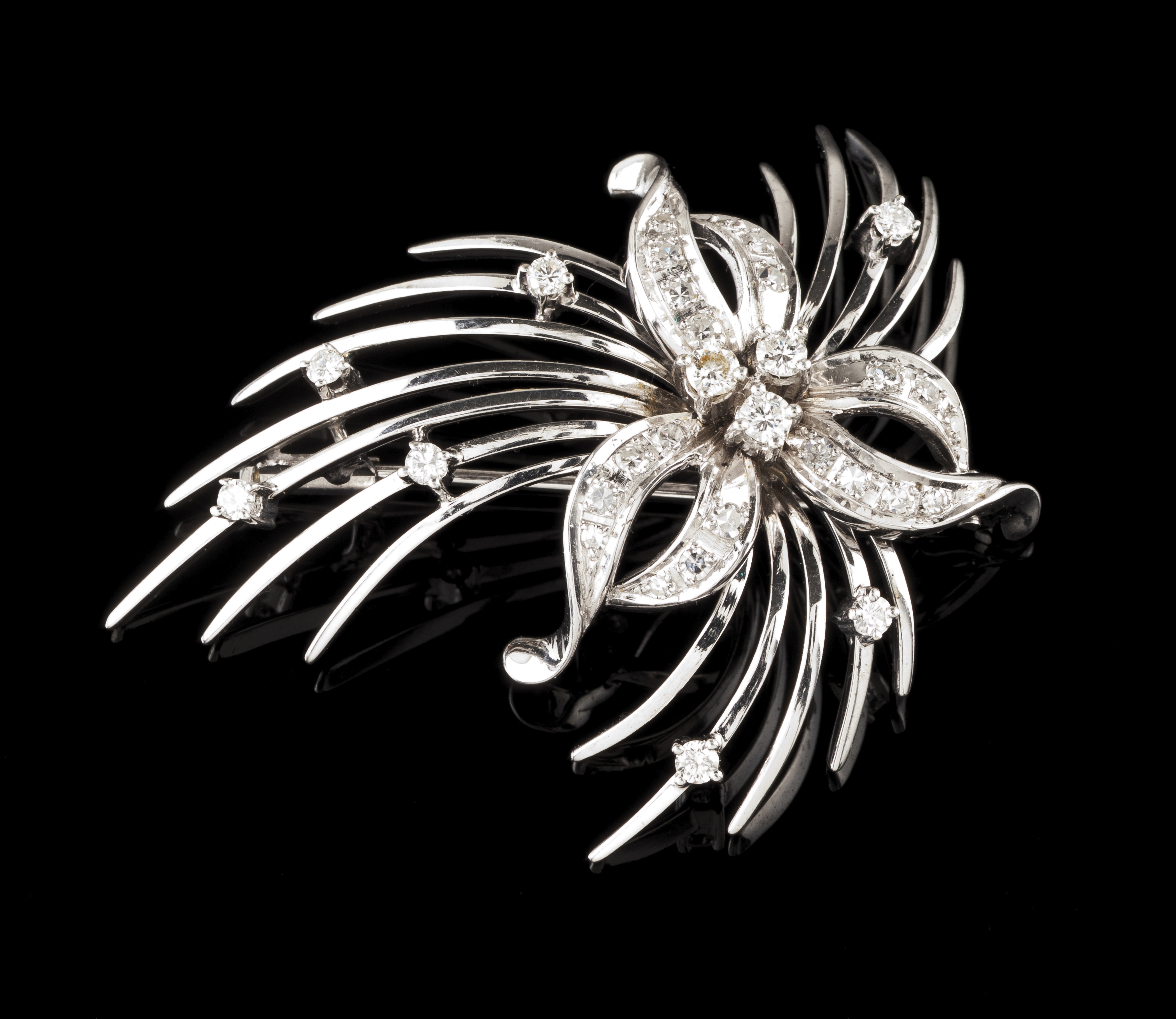 Set in 14kt gold with 32 brilliant and single cut diamonds (ca. 0,80ct)