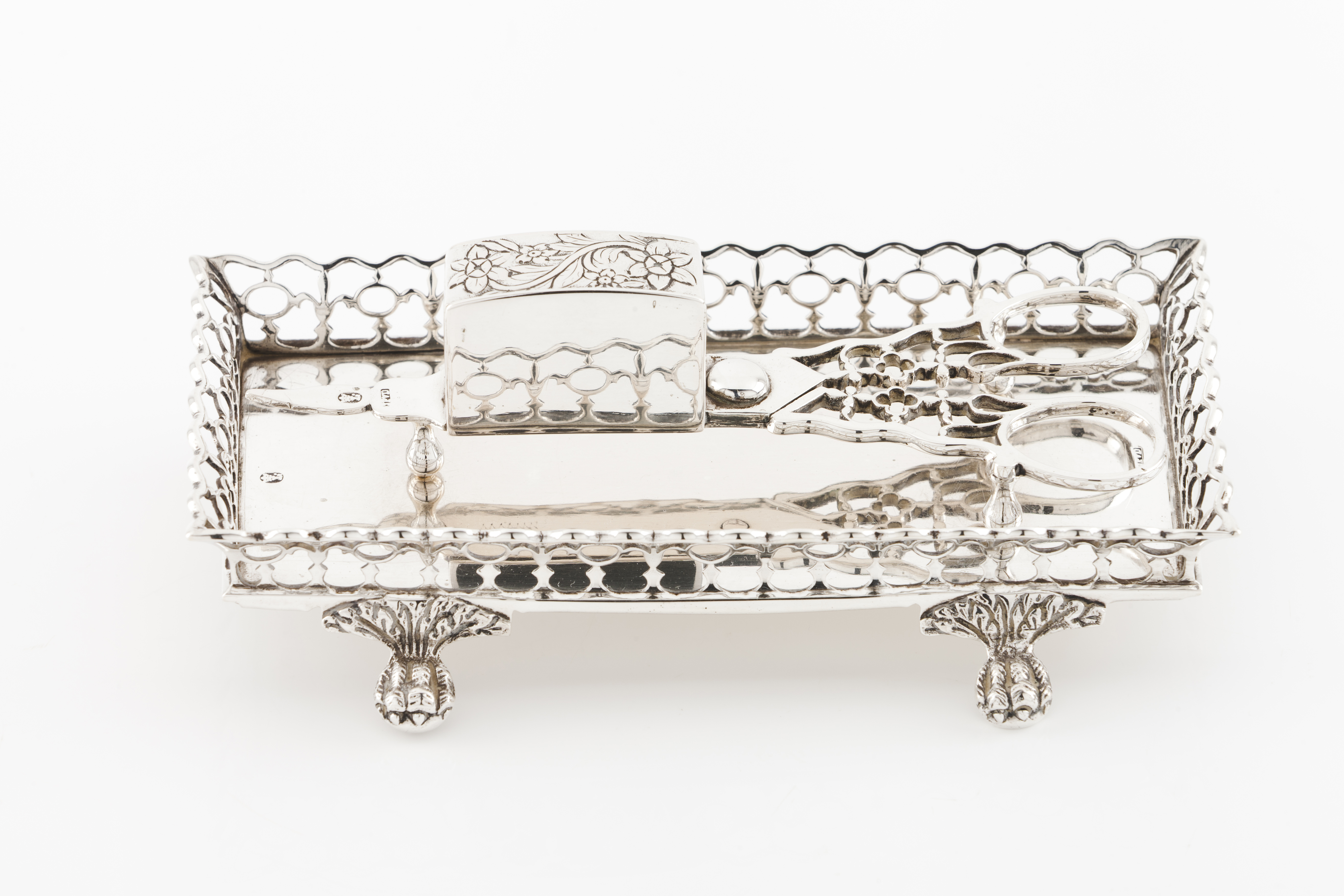 Plain rectangular tray of pierced geometric motifs gallery on 4 zoomorphic feet and scissors of pierced handles and foliage frieze
