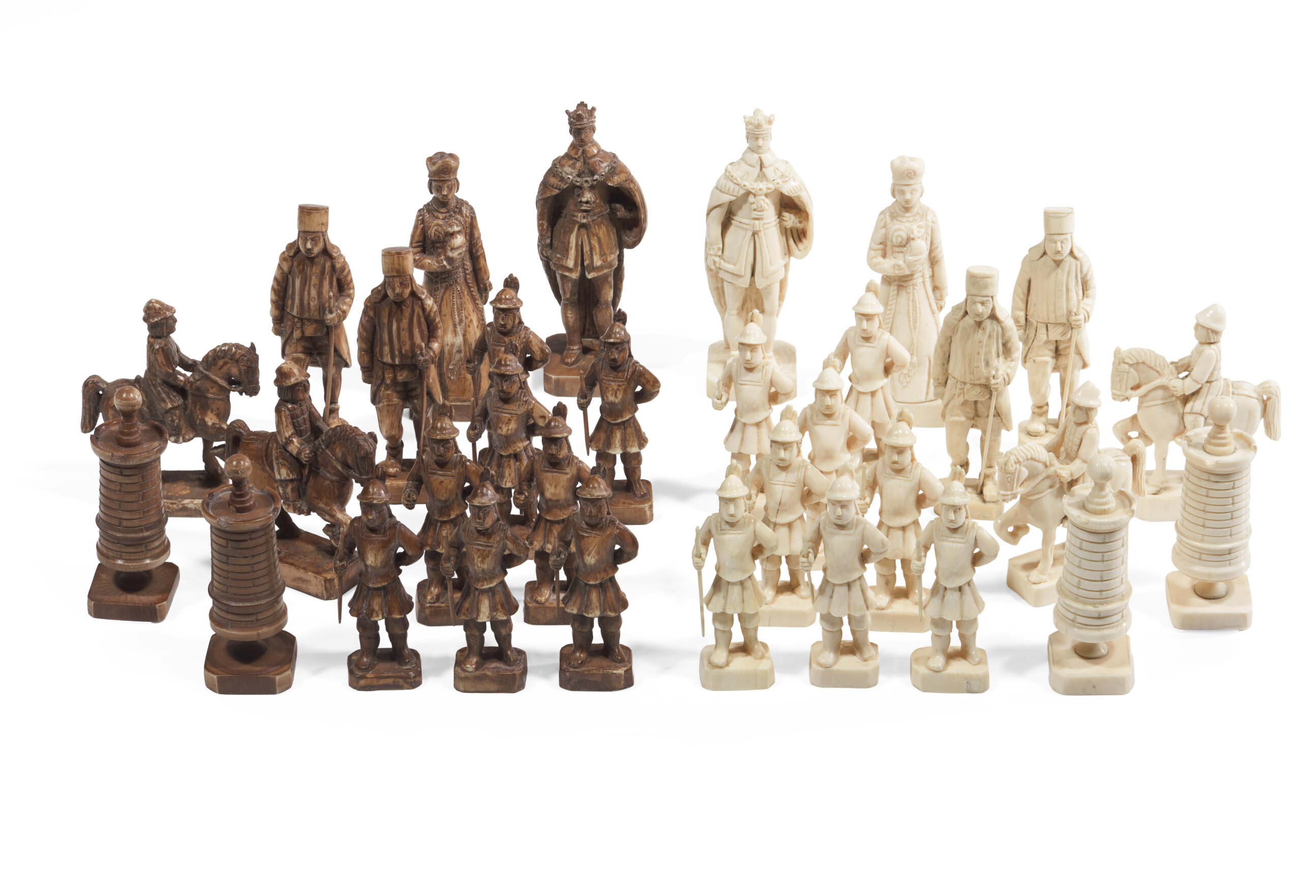 Complete set of thirty-two carved pieces, representing figures in European dress, standing on square plinths