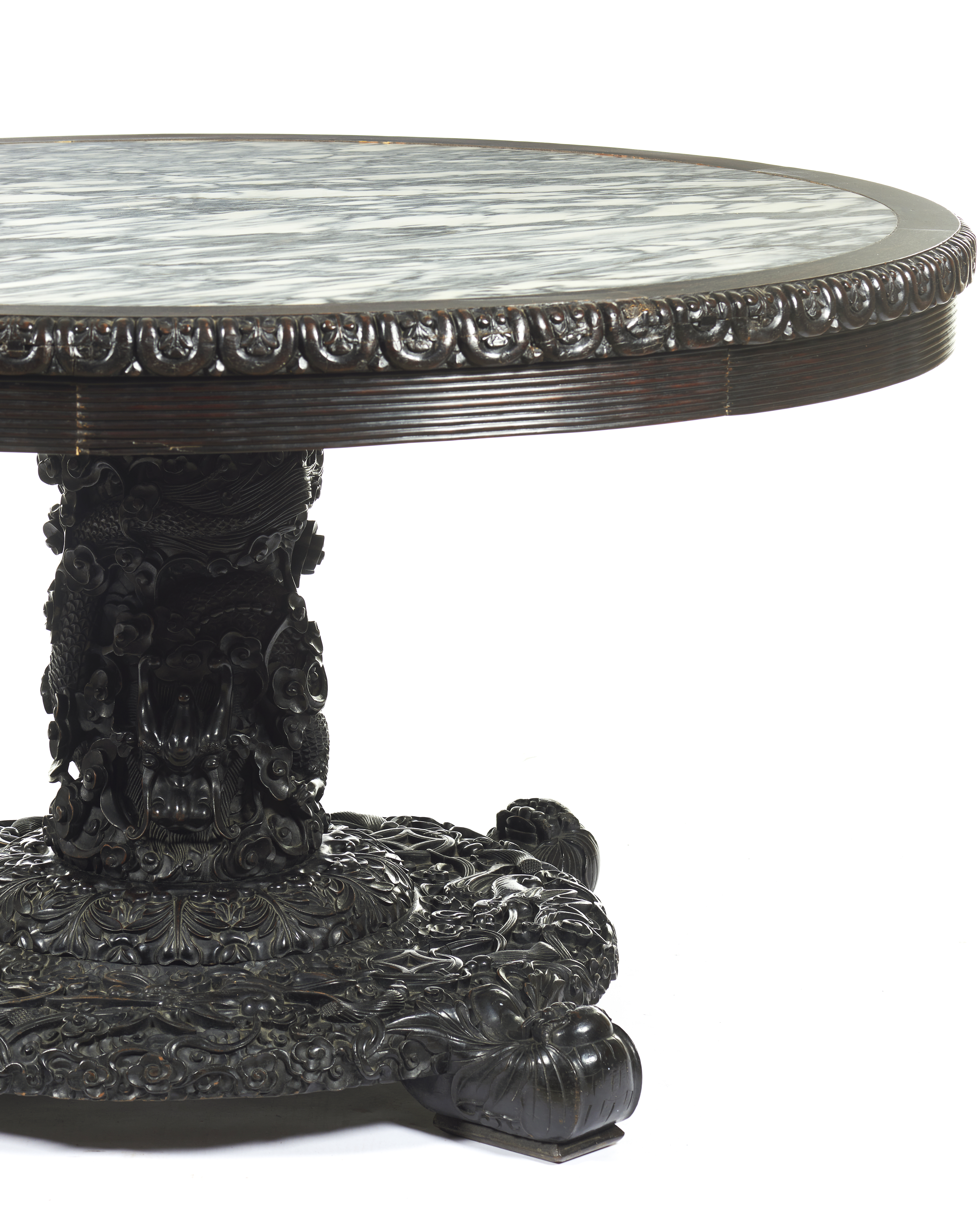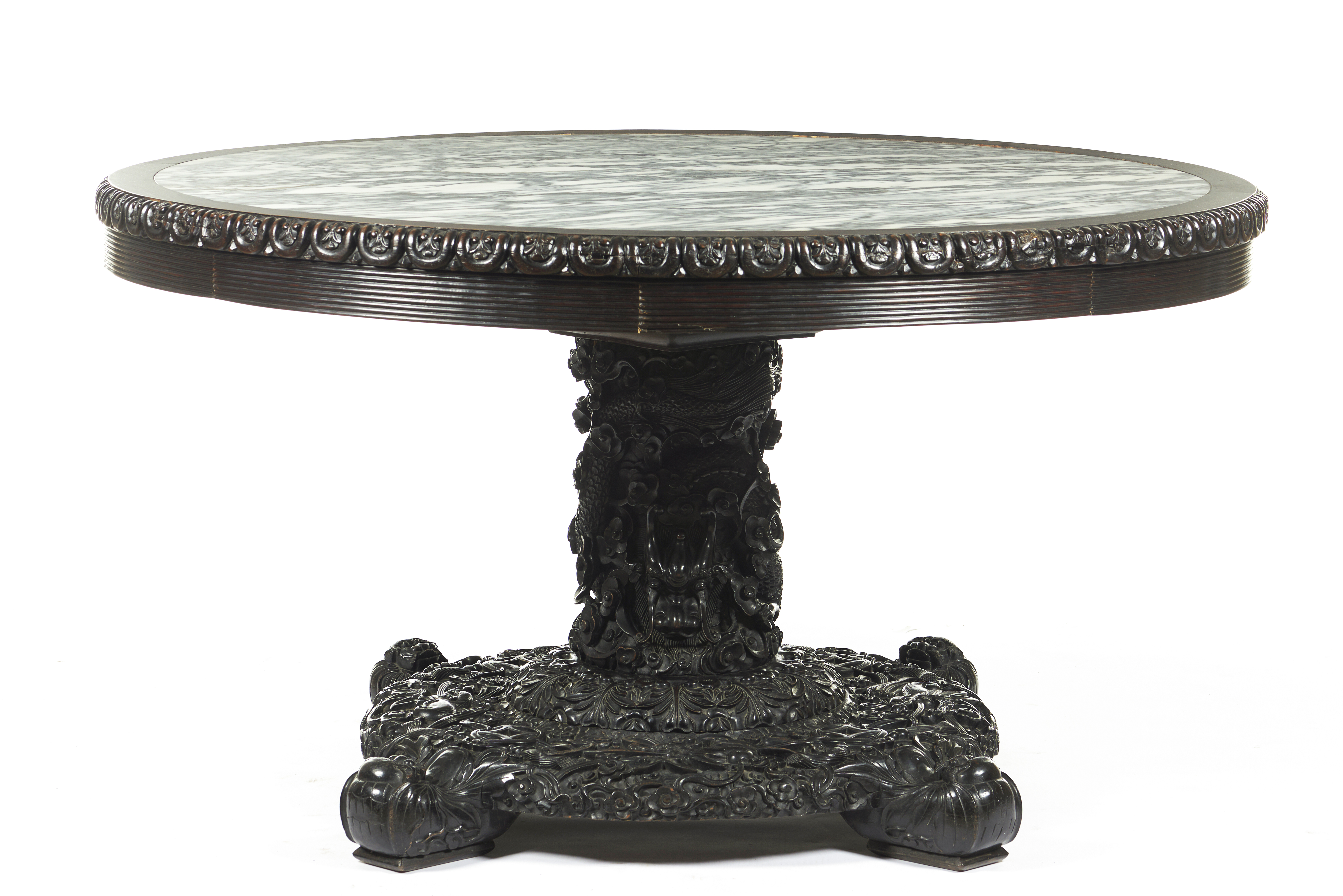 Carved decoration, central shaft and four feet featuring dragon, bats, auspicious symbols, clouds and foliage motifs