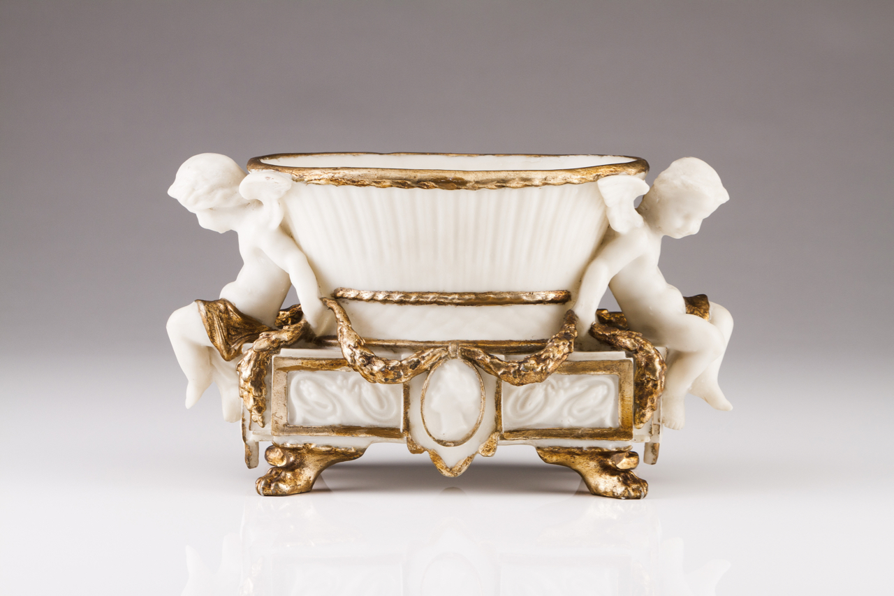 Cherubs flanking basket and holding garlands, base decorated with feminine figures and four zoomorphic feet