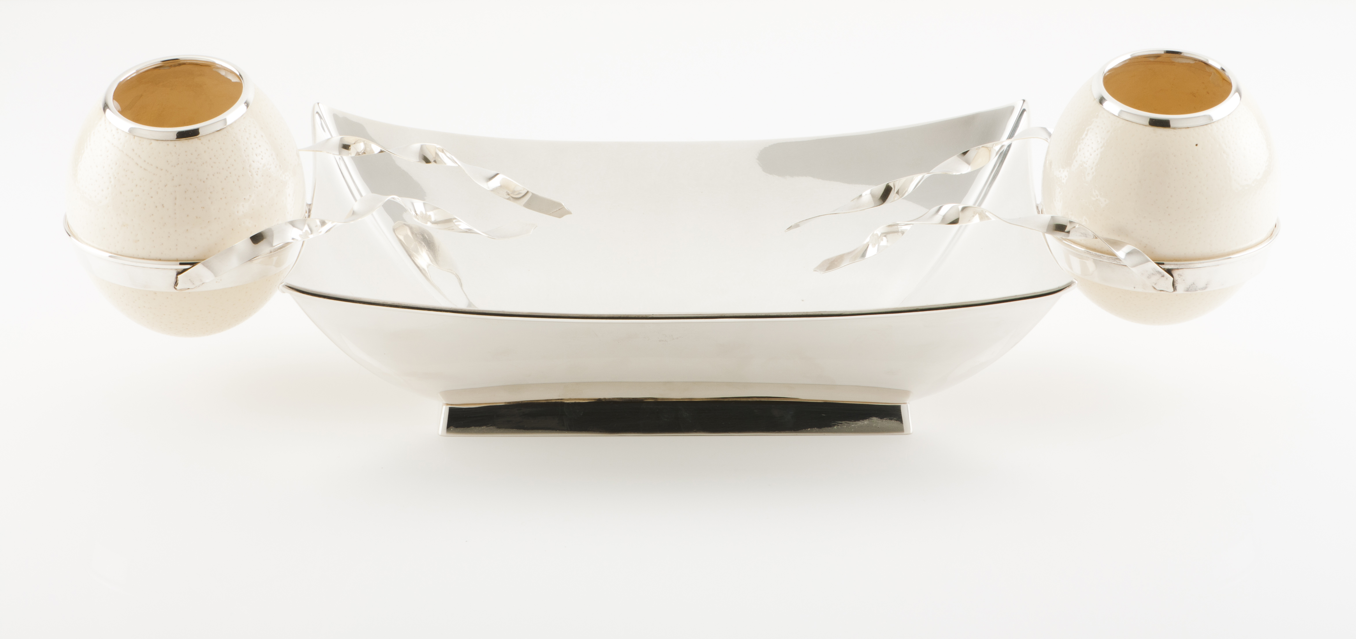 Rectangular base with support for two ostrich egg flower bowls and undulating decoration