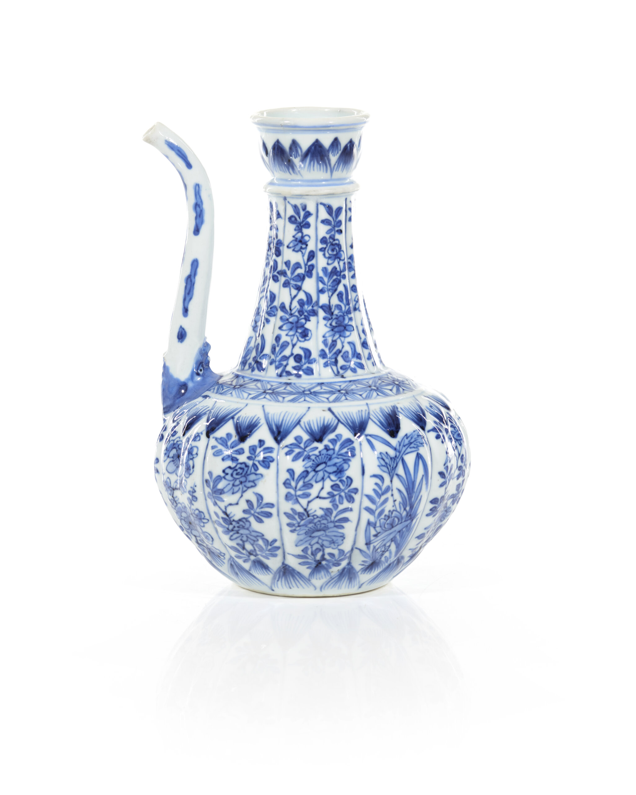Decorated in underglaze blue with vertical panels of stylised flowers, floral sprays, geometric friezes and lotus petals