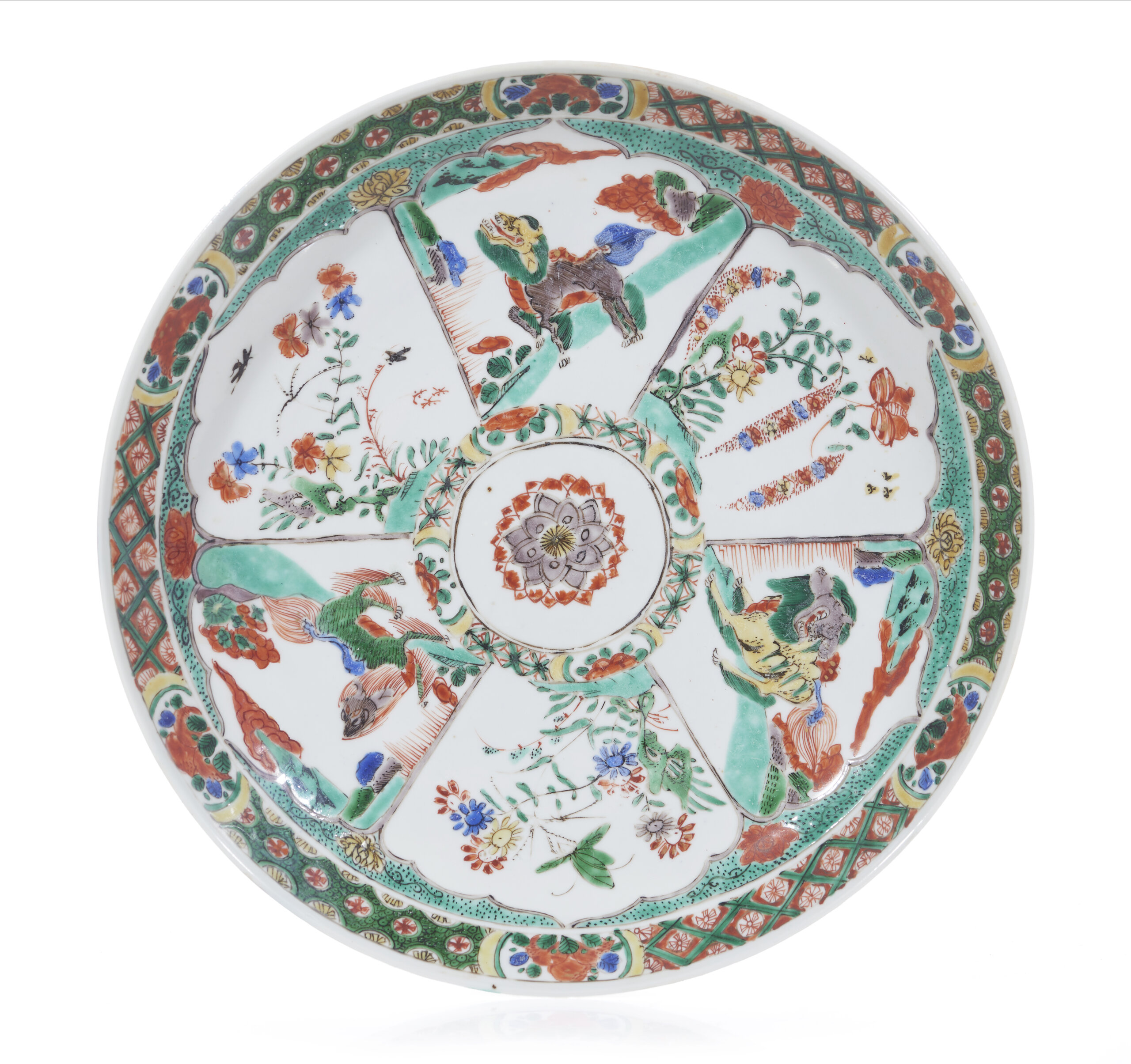 Polychrome Famille Verte enamel decoration depicting reserves with landscapes, flowers and qilins