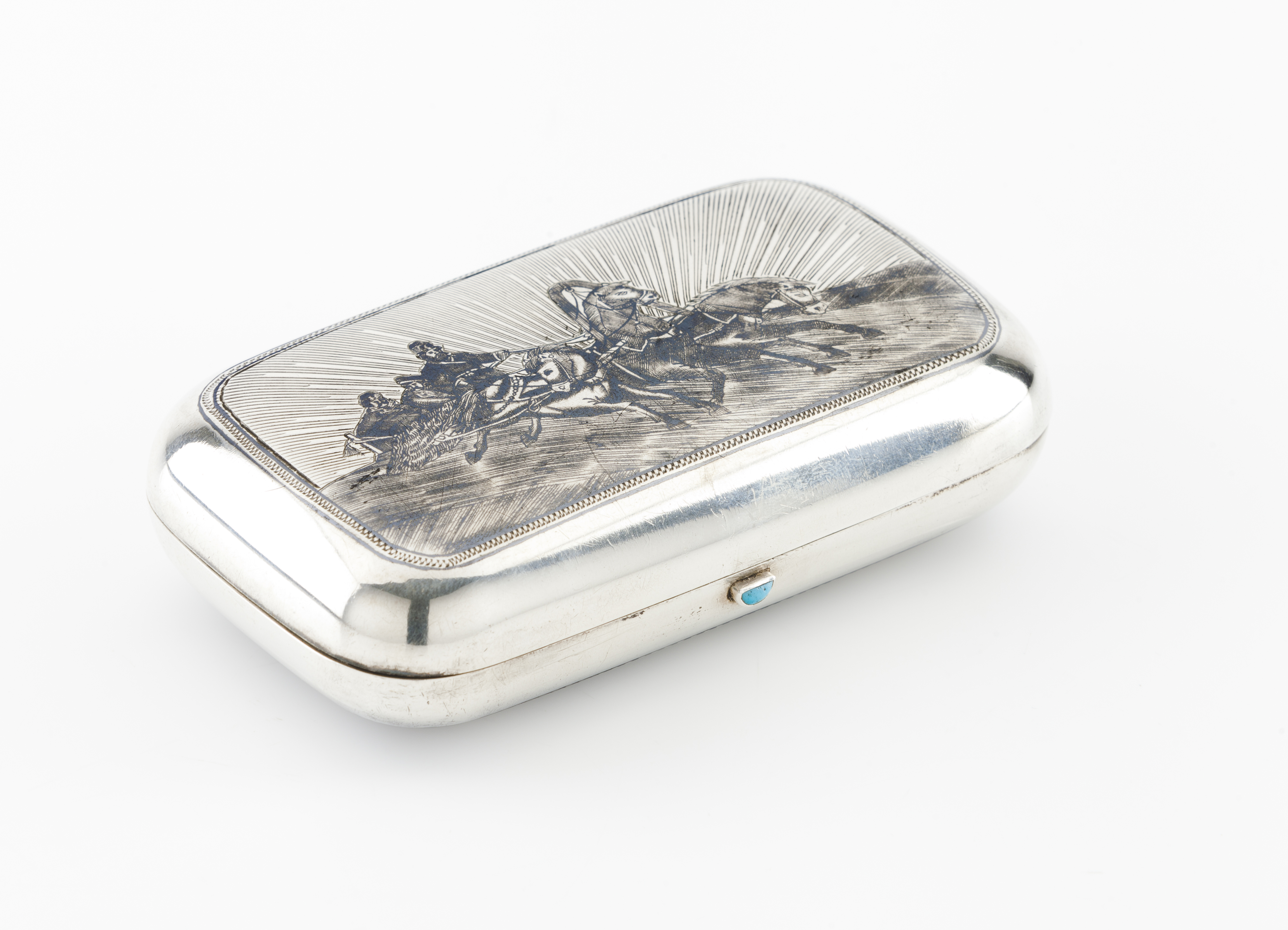 Engraved to cover with three horse troika with three figures on a snowy landscape
