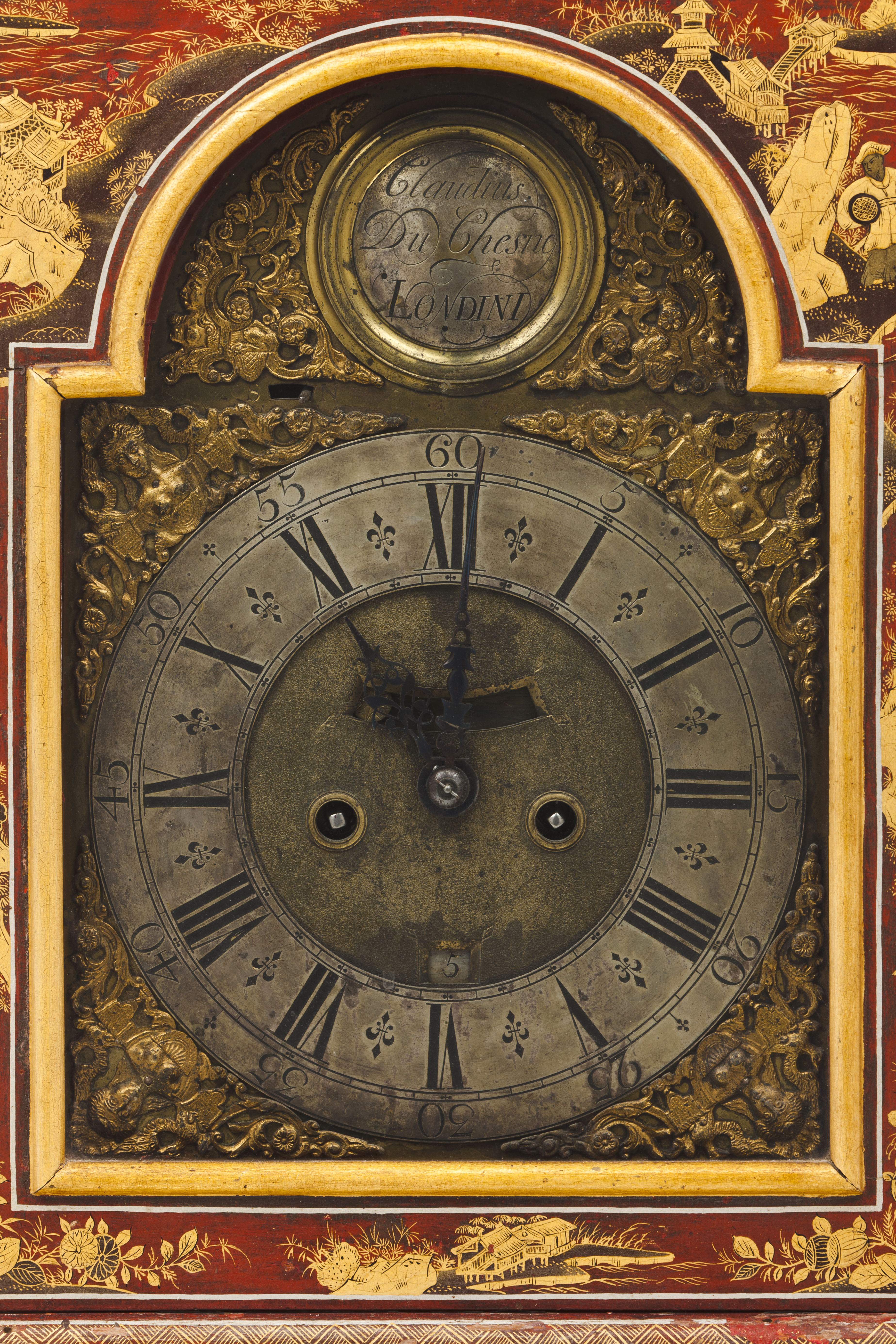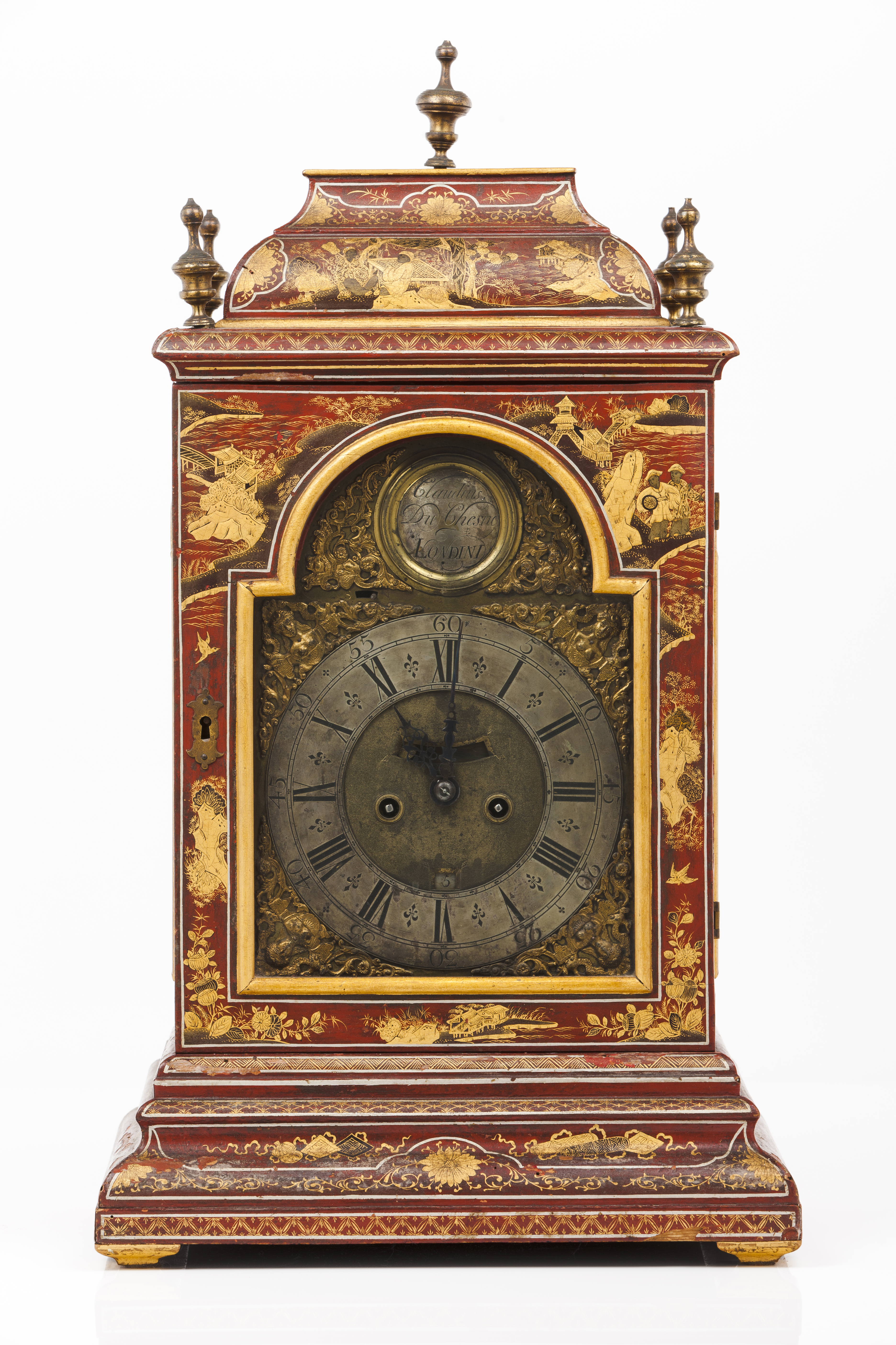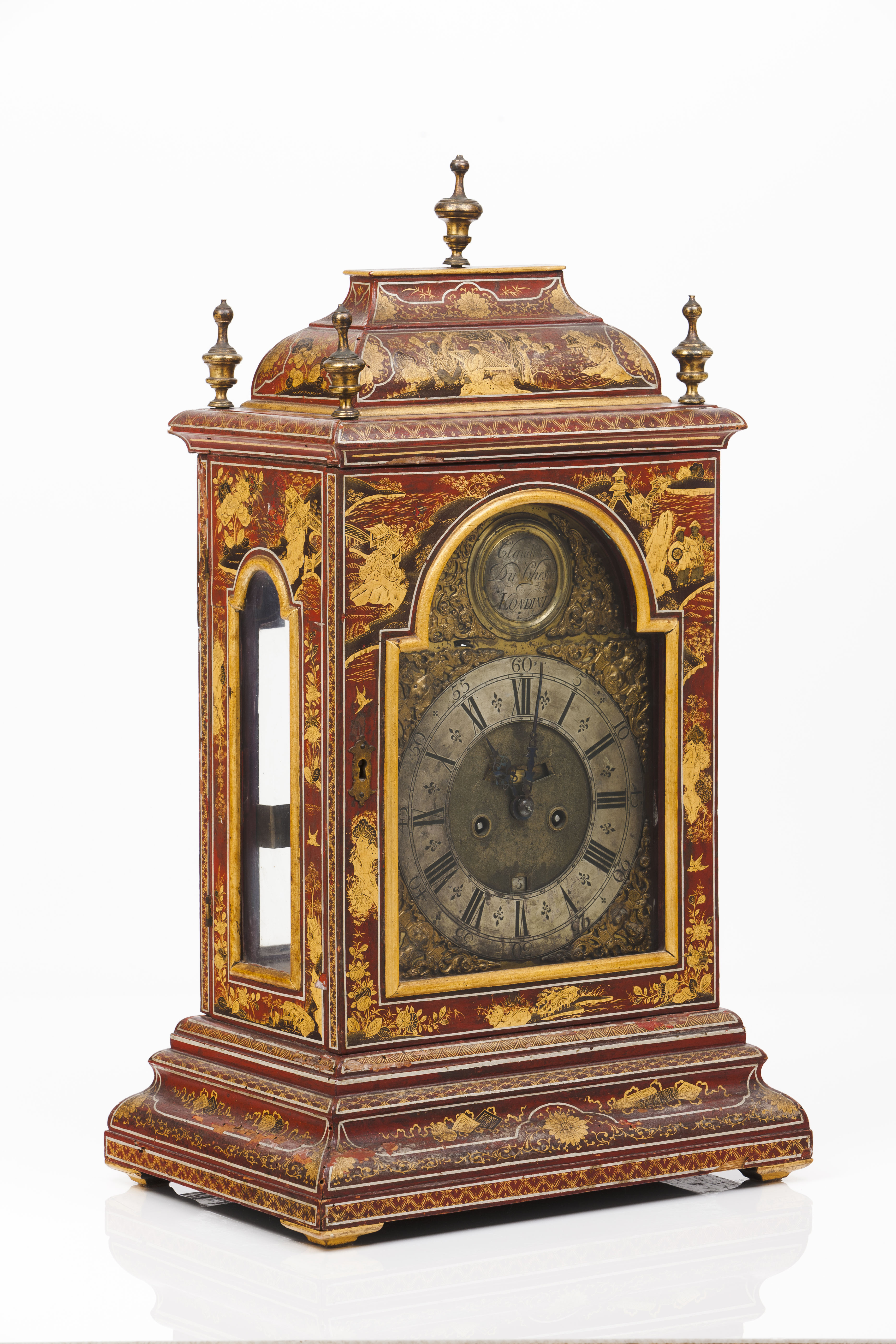 Of French origin, the clockmaker Claudius Duchesne worked in Paris up until 1685, when the revoking of the Edict of Nantes by King Louis XIV triggered a massive exodus of French Huguenot emigrants towards England. Forced to abandon Paris he will eventually settle in London, a safe haven for many of those who escaped persecution in France. It is recorded that in 1693 he became a Free Brother at the Clockmaker’s Company and lived in Long Acre, at Saint Anne’s Parish in Soho, one of his known engraved clocks being marked with the address “Dean Street, Soho”. Although unconfirmed, it is believed that Duchesne lived up to 1730 and that he had at least one son, Antoine, who became a Freeman at the Goldsmiths' Company. Clocks made by Duchesne can be seen at the China Pavilion at the Palace of Drottningholm in Sweden, at Rosenborg Castle in Copenhagen as well as at the British Museum collection.