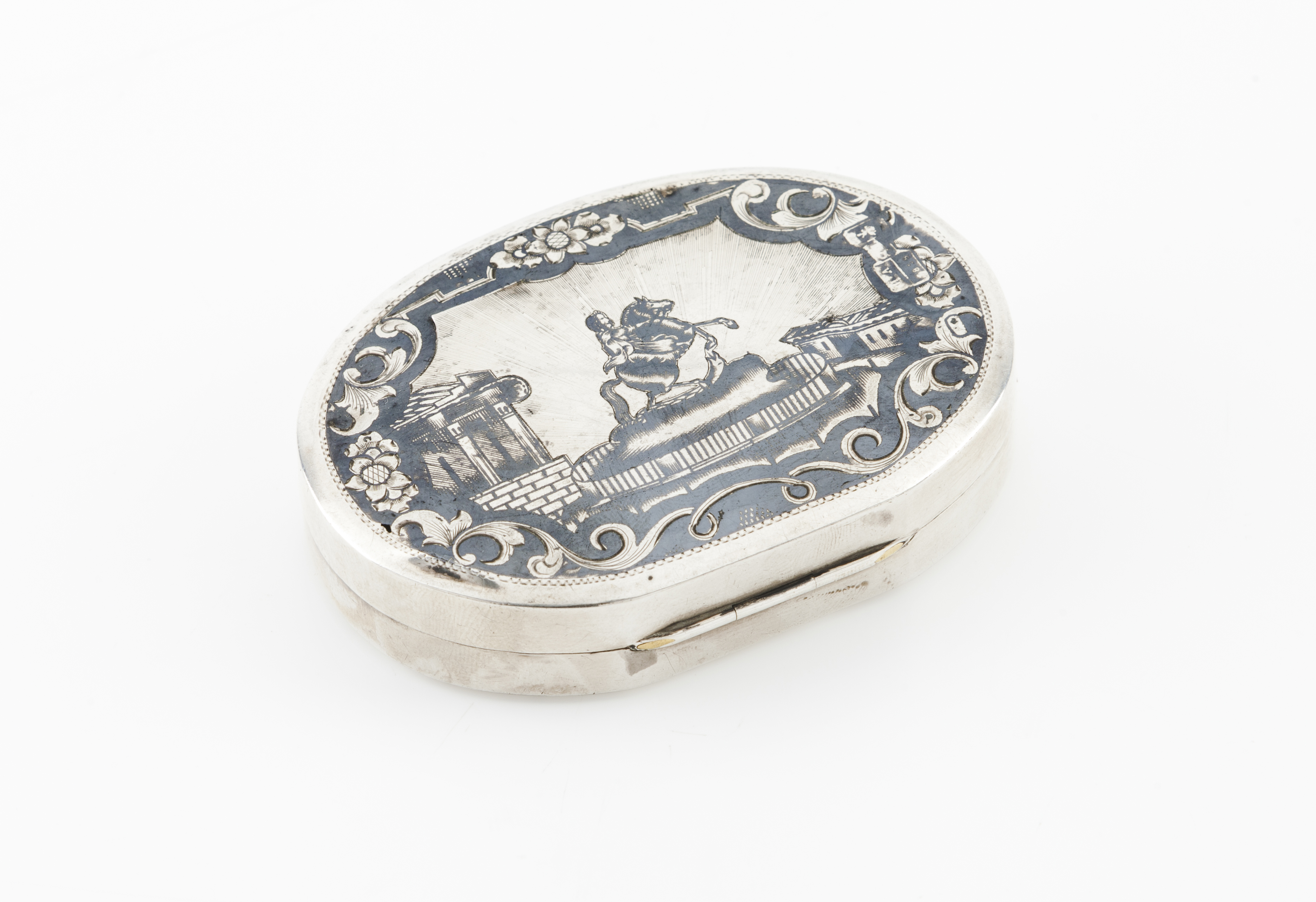 Engraved foliage and geometric motifs decoration and reverse with depiction of Saint Petersburg monument to Czar Peter the great