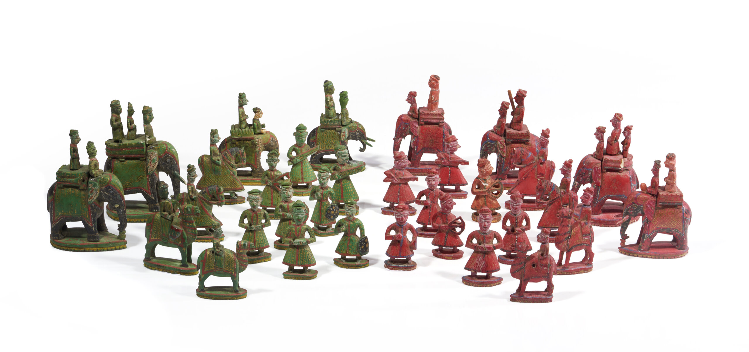 King and queen depicted in howdahs on elephants, bishops represented by princes also in howdahs, knights in the form of mounted cavalrymen, rooks as mounted camels, and pawns depicting standing soldiers, some holding shields and weapons