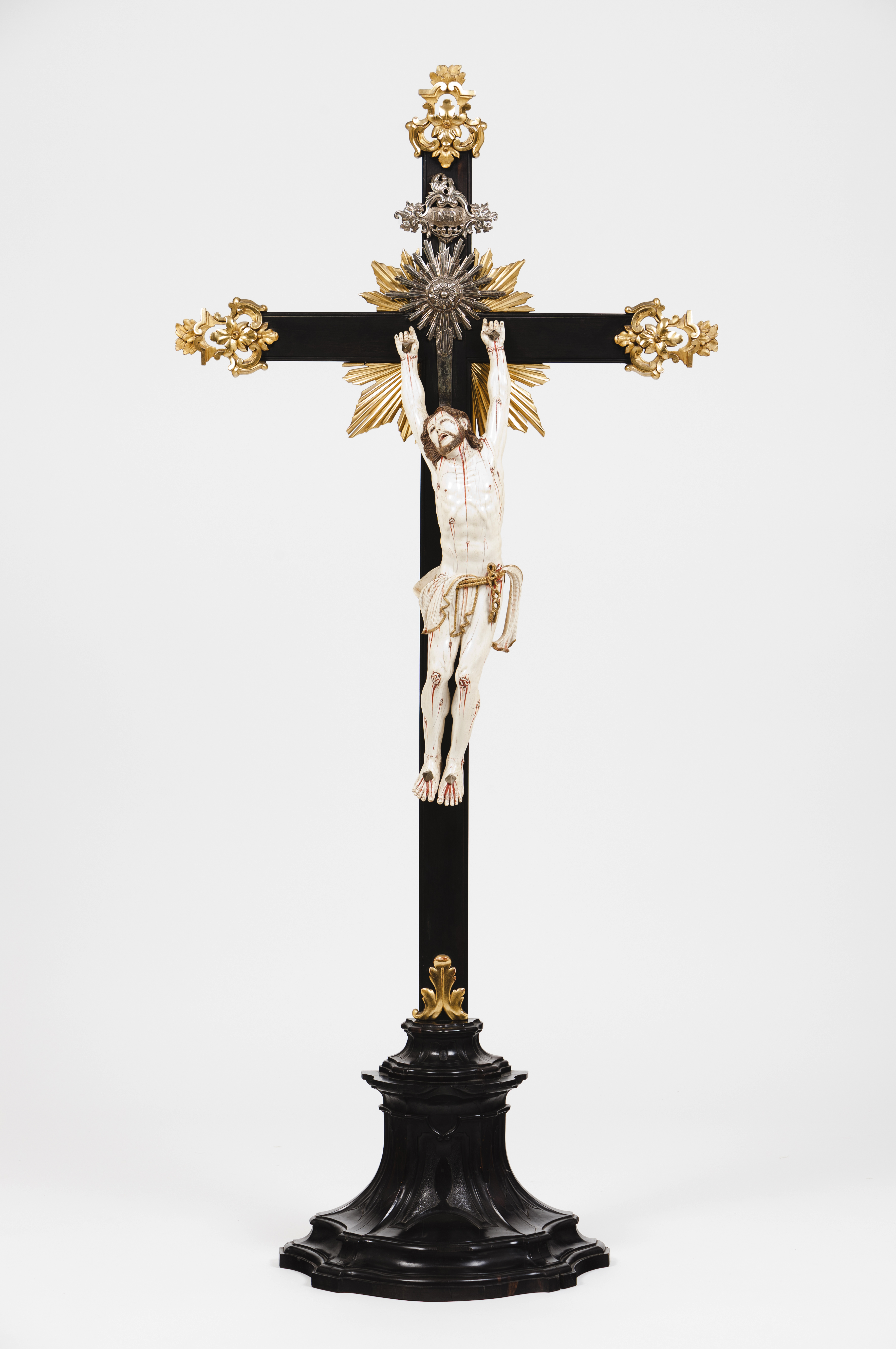 Rosewood cross and stand of gilt carved elements and applied silver mounts