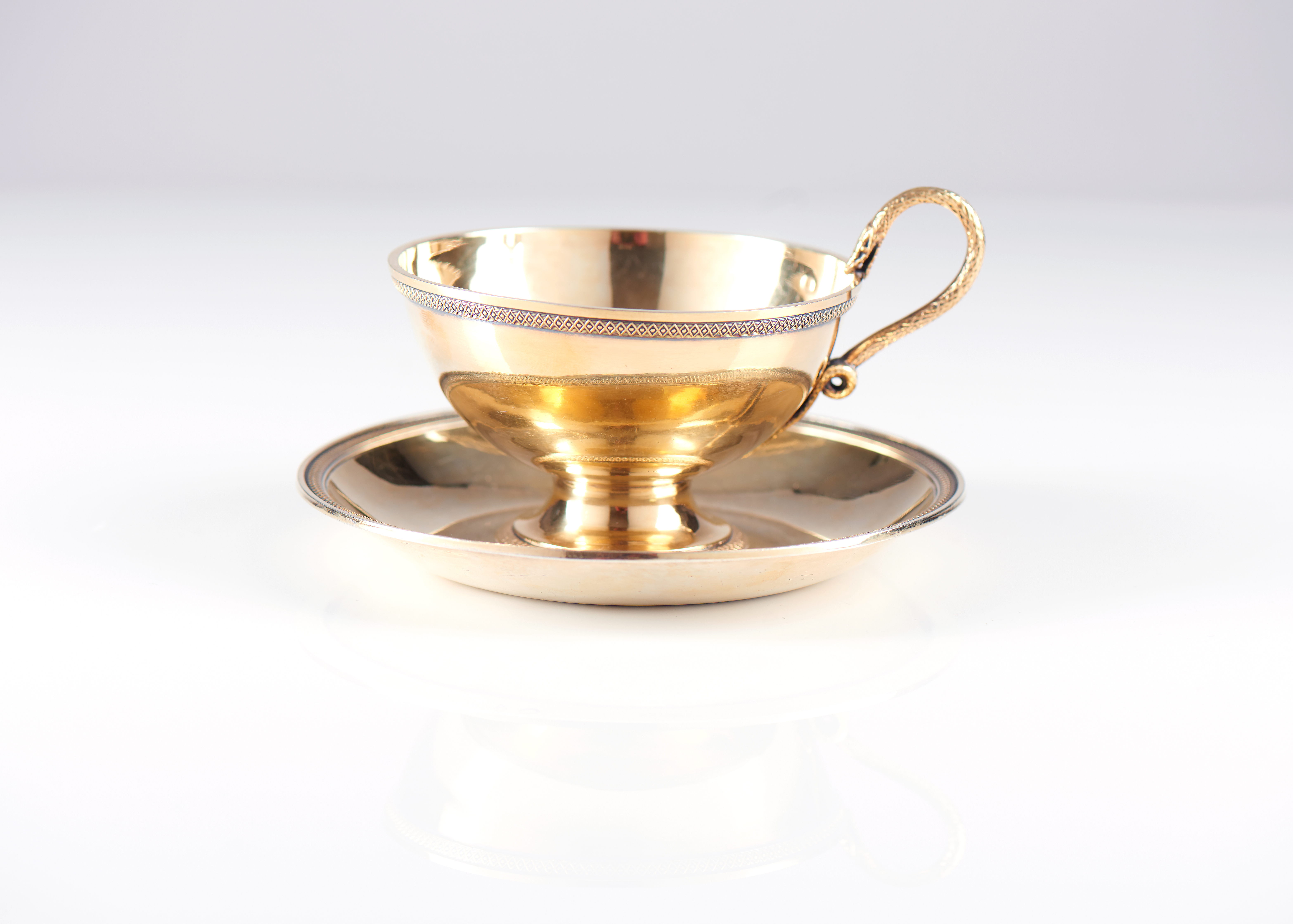 Maker L.R. RUCHMANN, of banded friezes rim decoration on an engine turned ground, the handle shaped a as double tailed snake