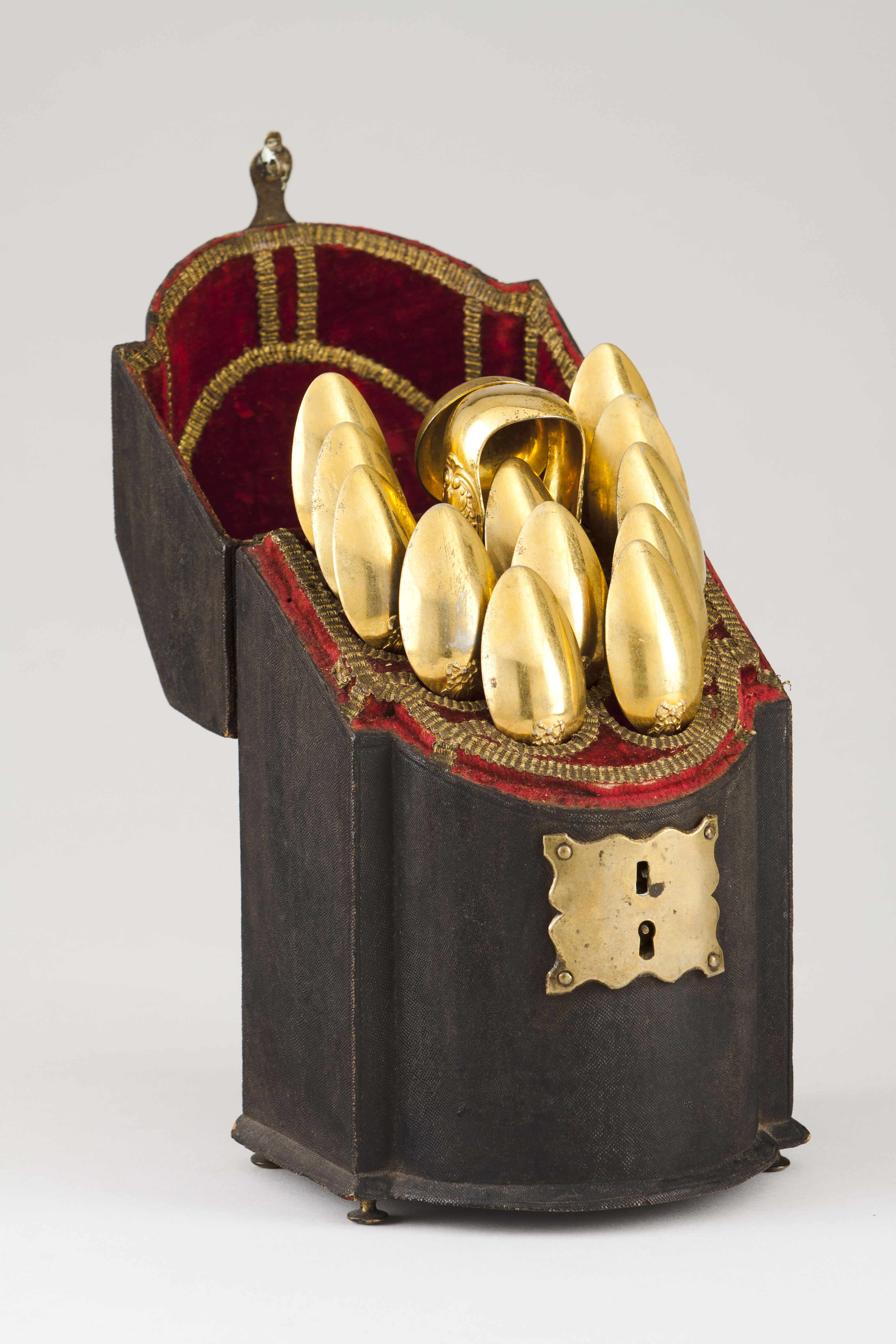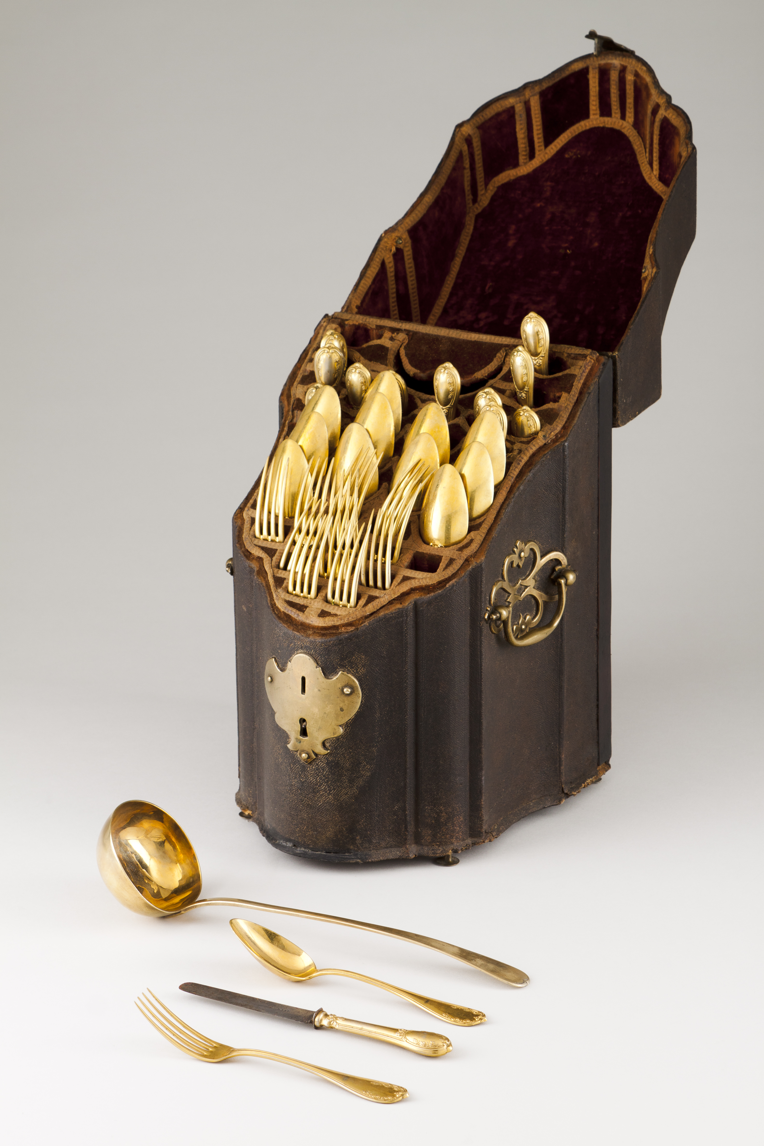 Romantic period decoration to handles front and flowers, bows and ribbons to reverse
