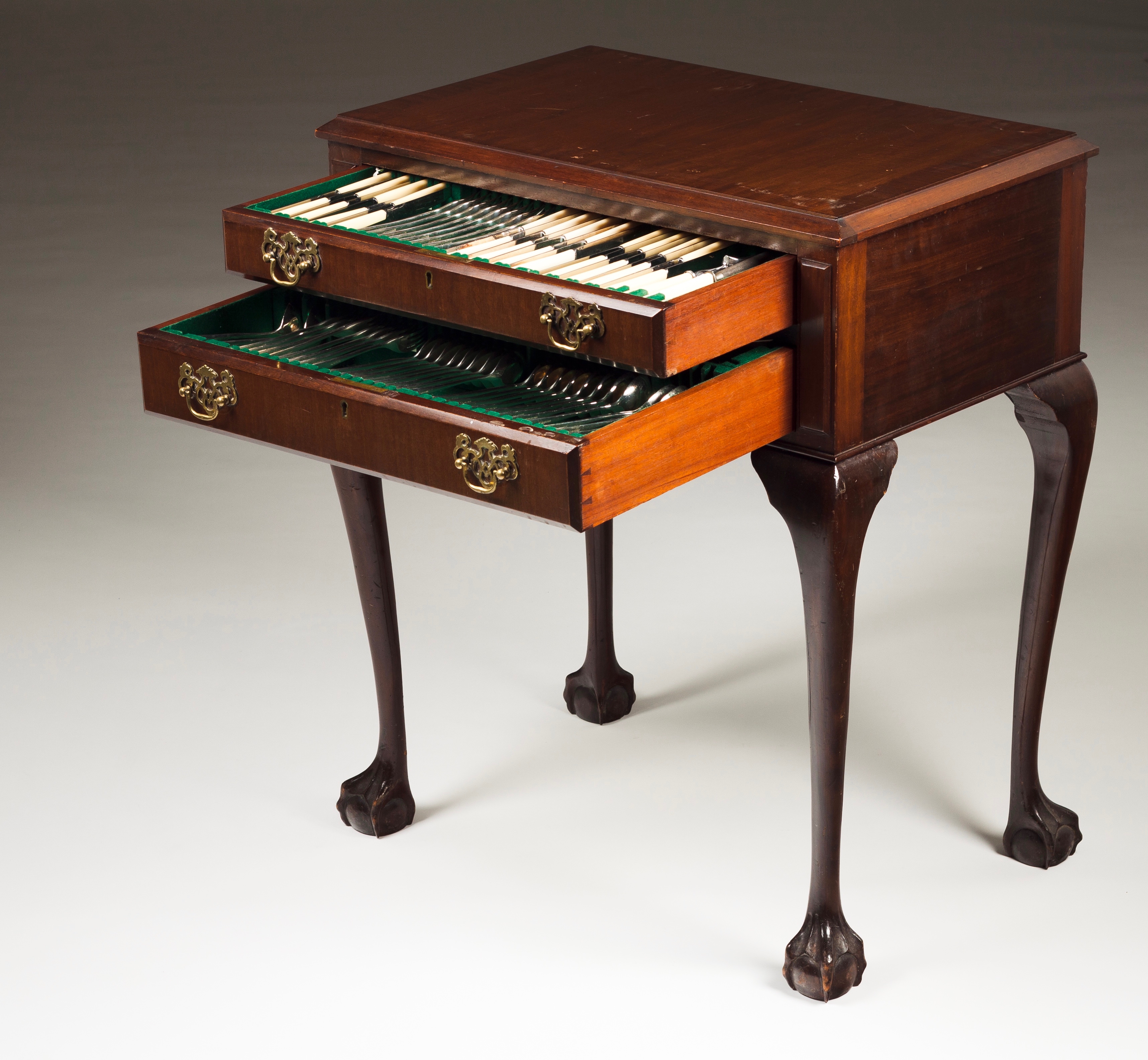 Mahogany, cabriole legs with claw feet, two drawers with scalloped brass mounts