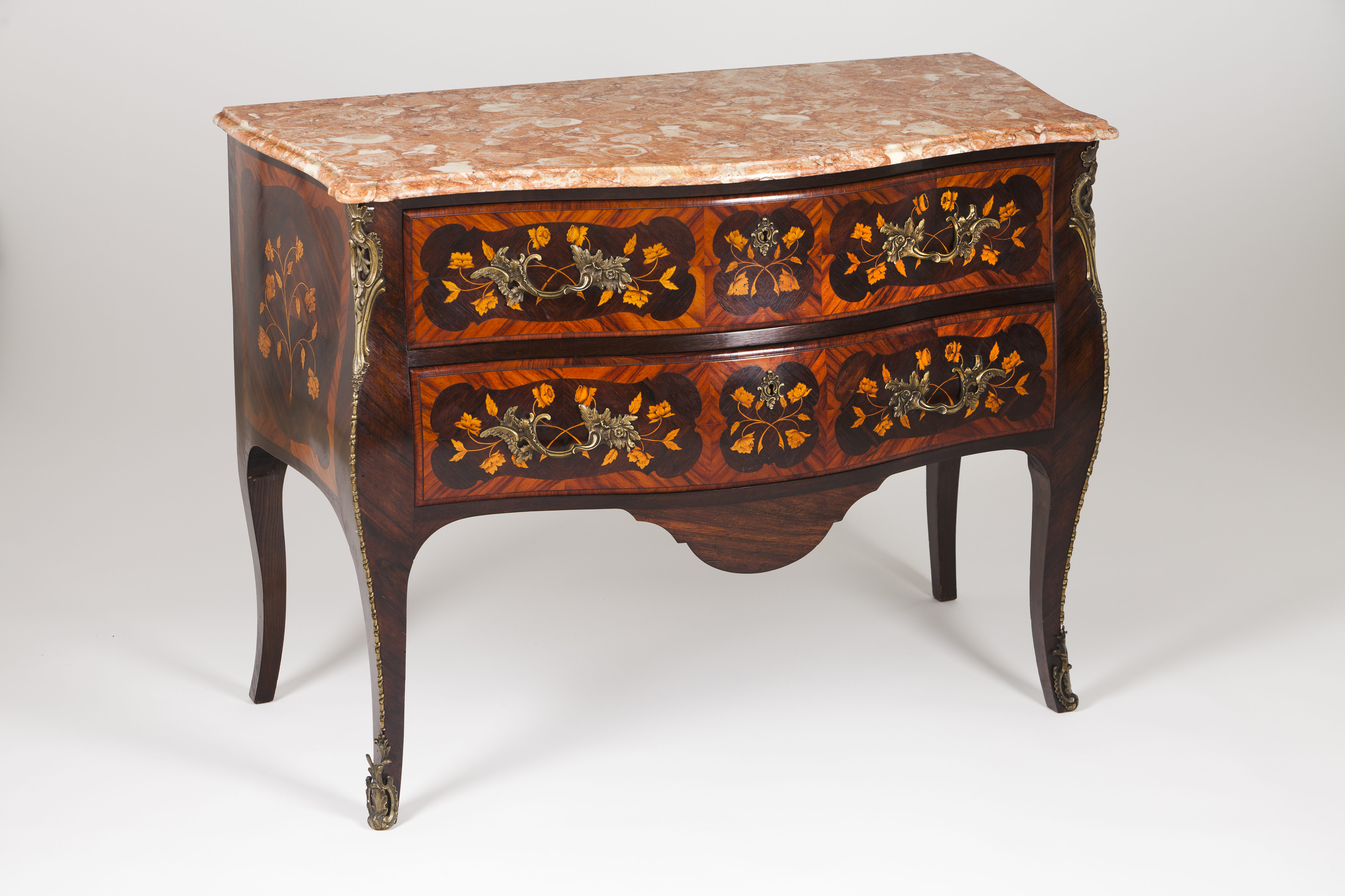 Solid and veneered rosewood of thornbush and other timbers marquetry decoration with foliage motifs