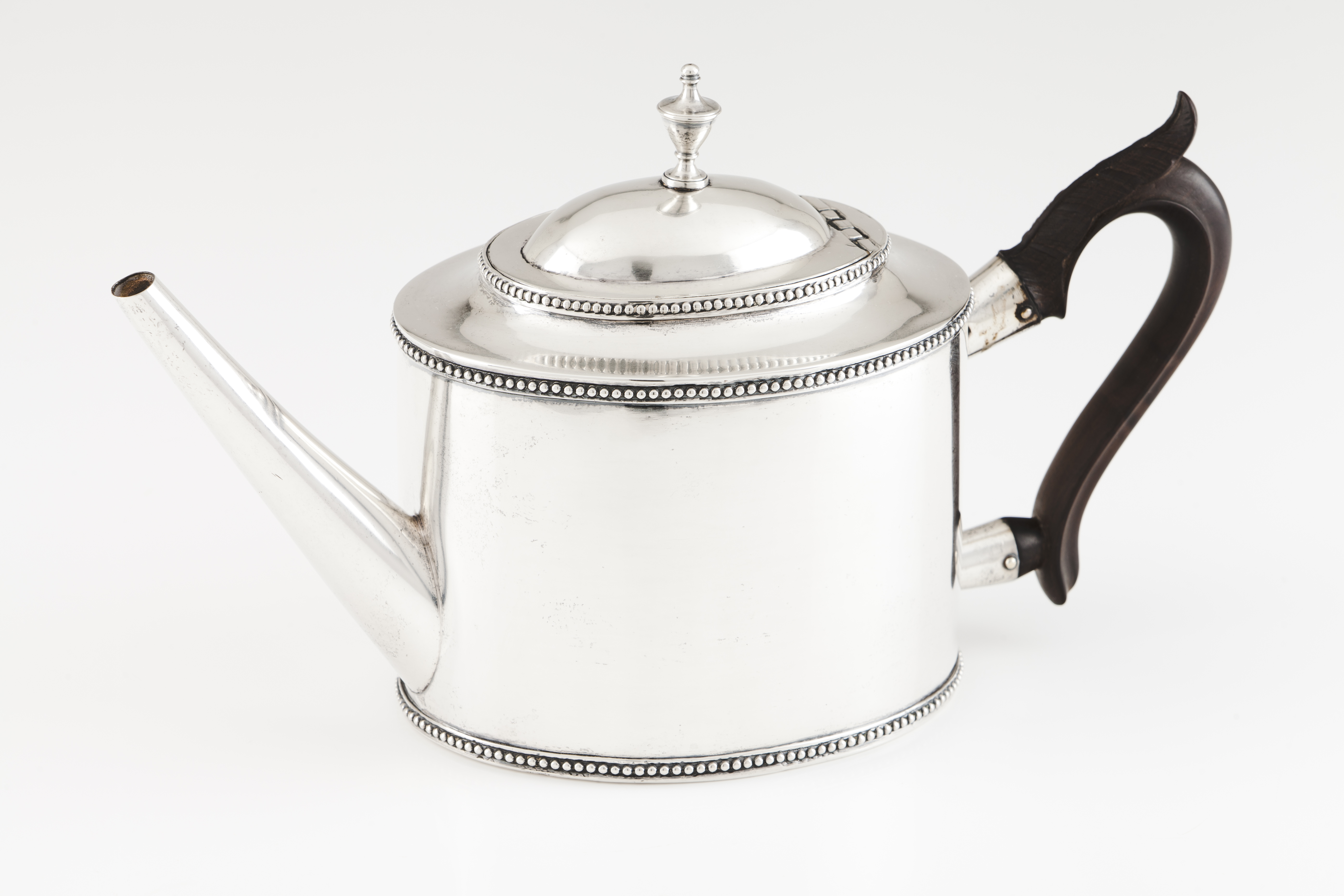 Oval shaped plain body of beaded friezes to base, rim and cover