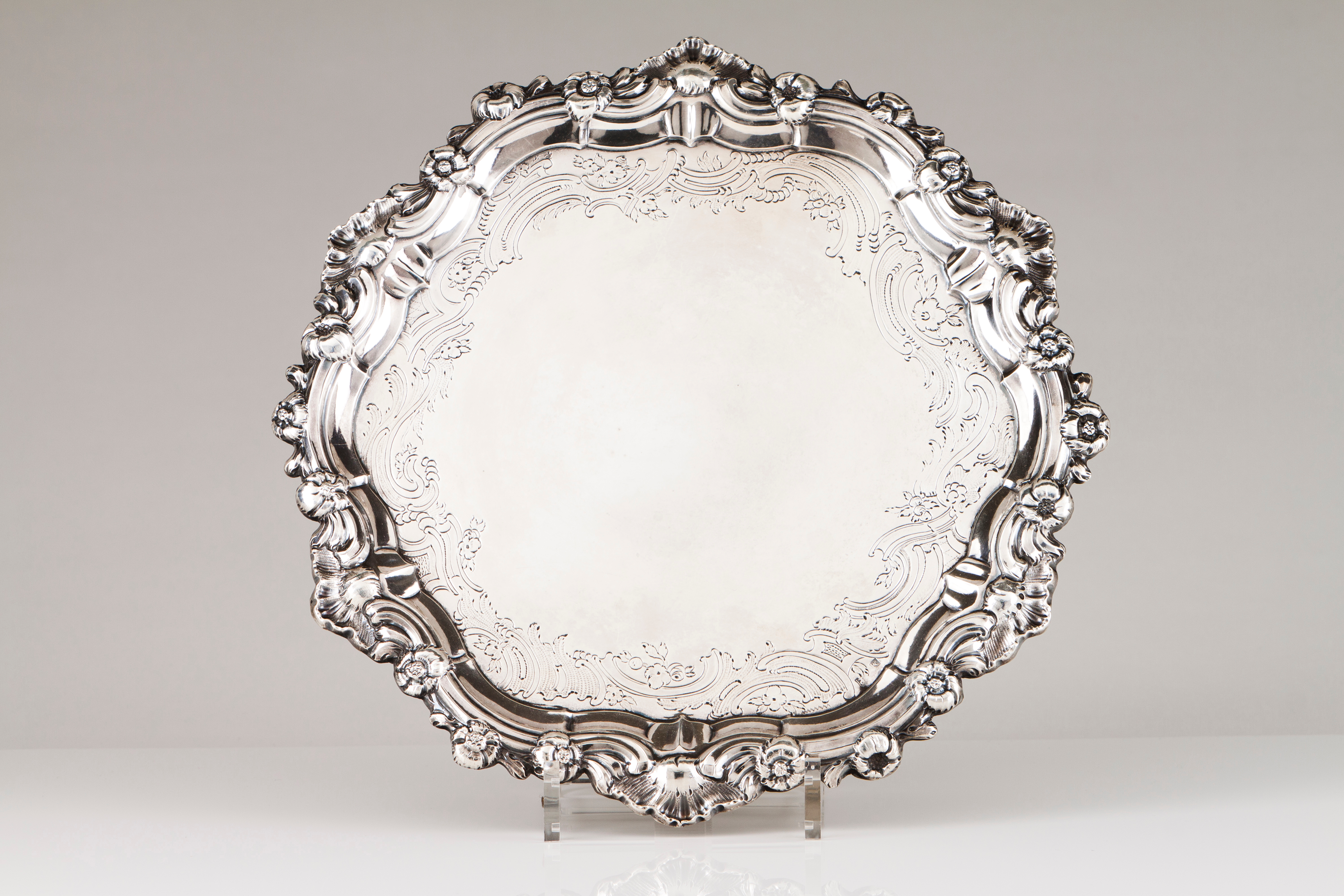 Raised on three ball and claw feet, tab decorated in relief with volutes, shell and floral motifs; centre engraved with rocaille motifs