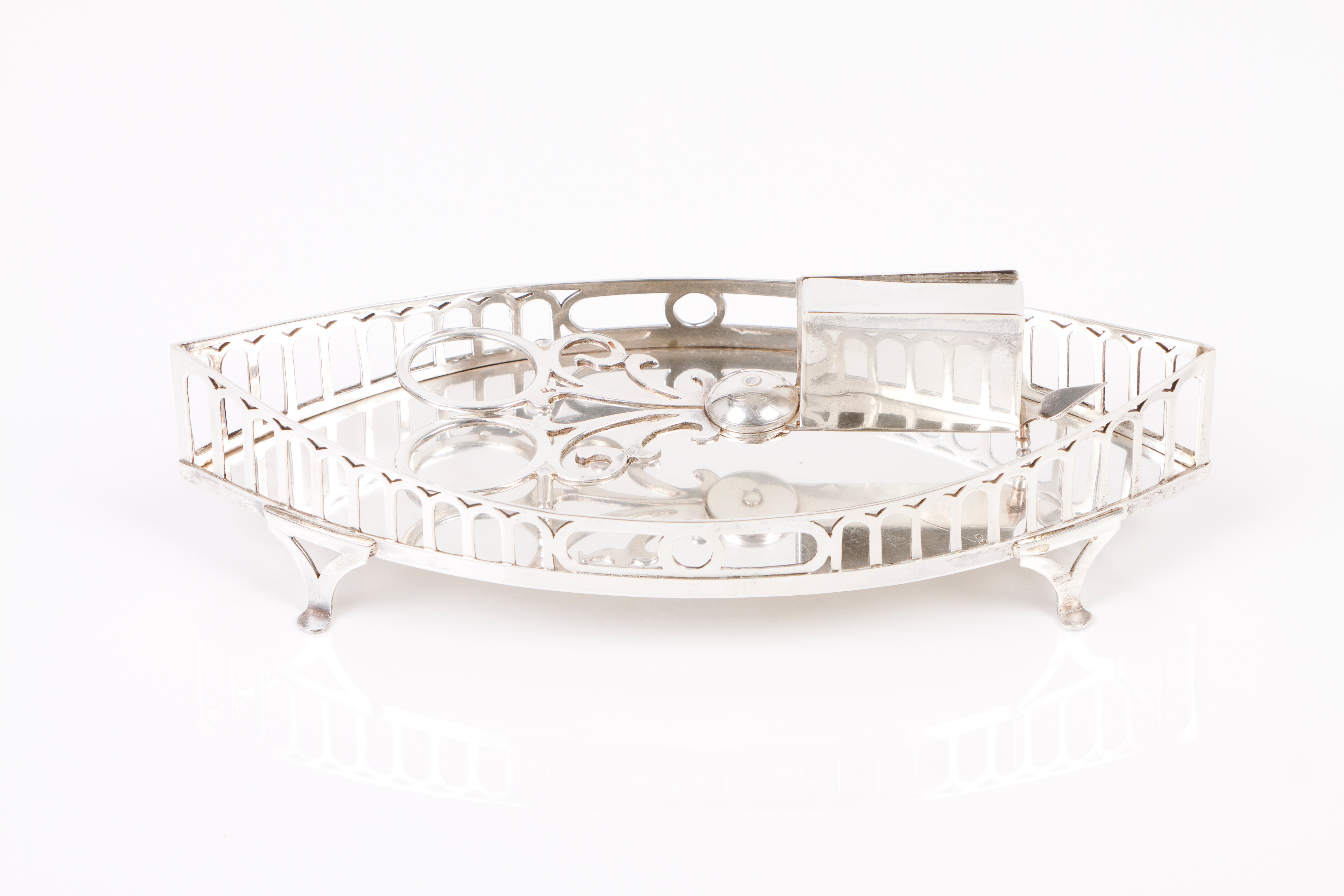 Navette shaped tray with pierced gallery and feet, scalloped snuffers
