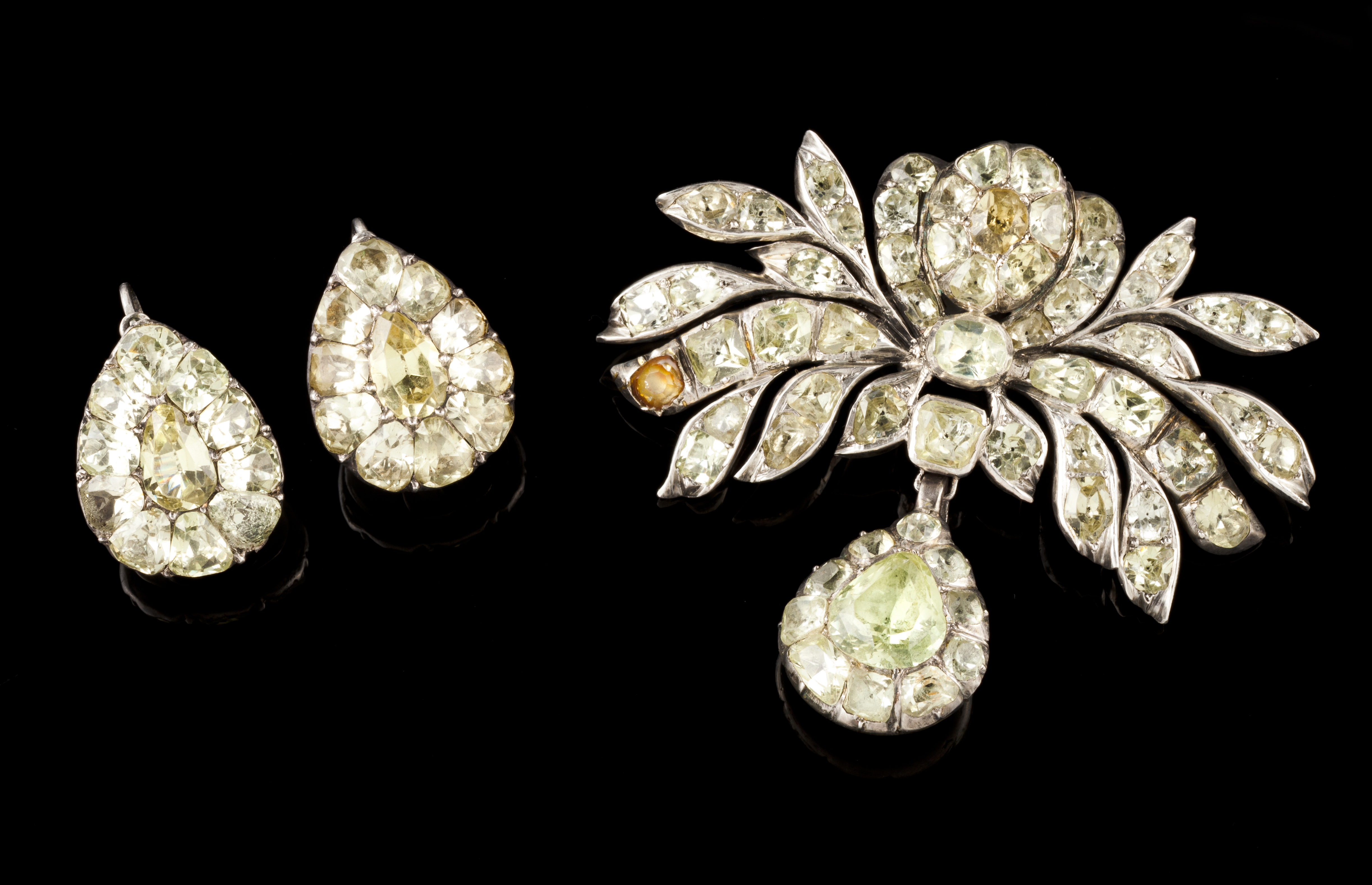 Comprising a "laça" brooch with pear-shaped drop and a pair of pear-shaped earrings
