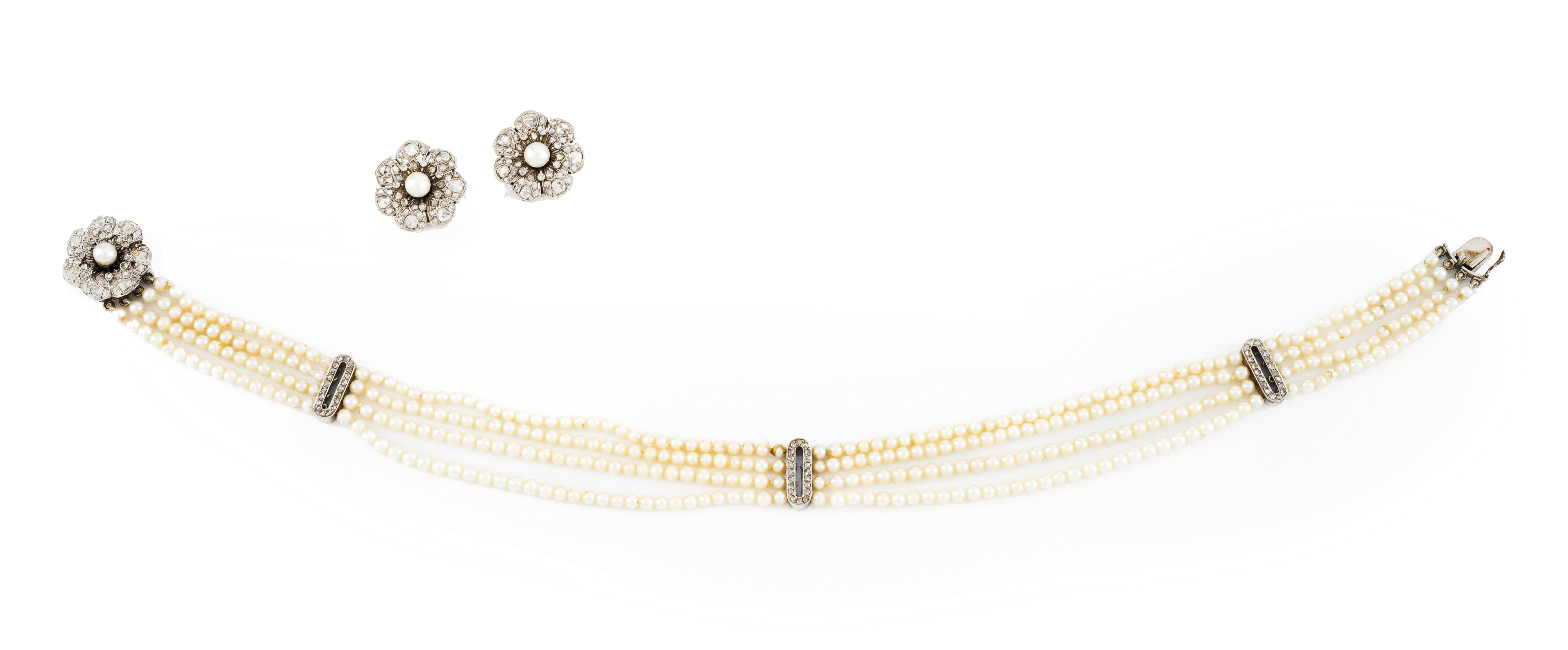 Four strands cultured pearl necklace (ca. 3.2 mm) with white gold and cross bars set with antique cut, table and crowned rose cut diamonds