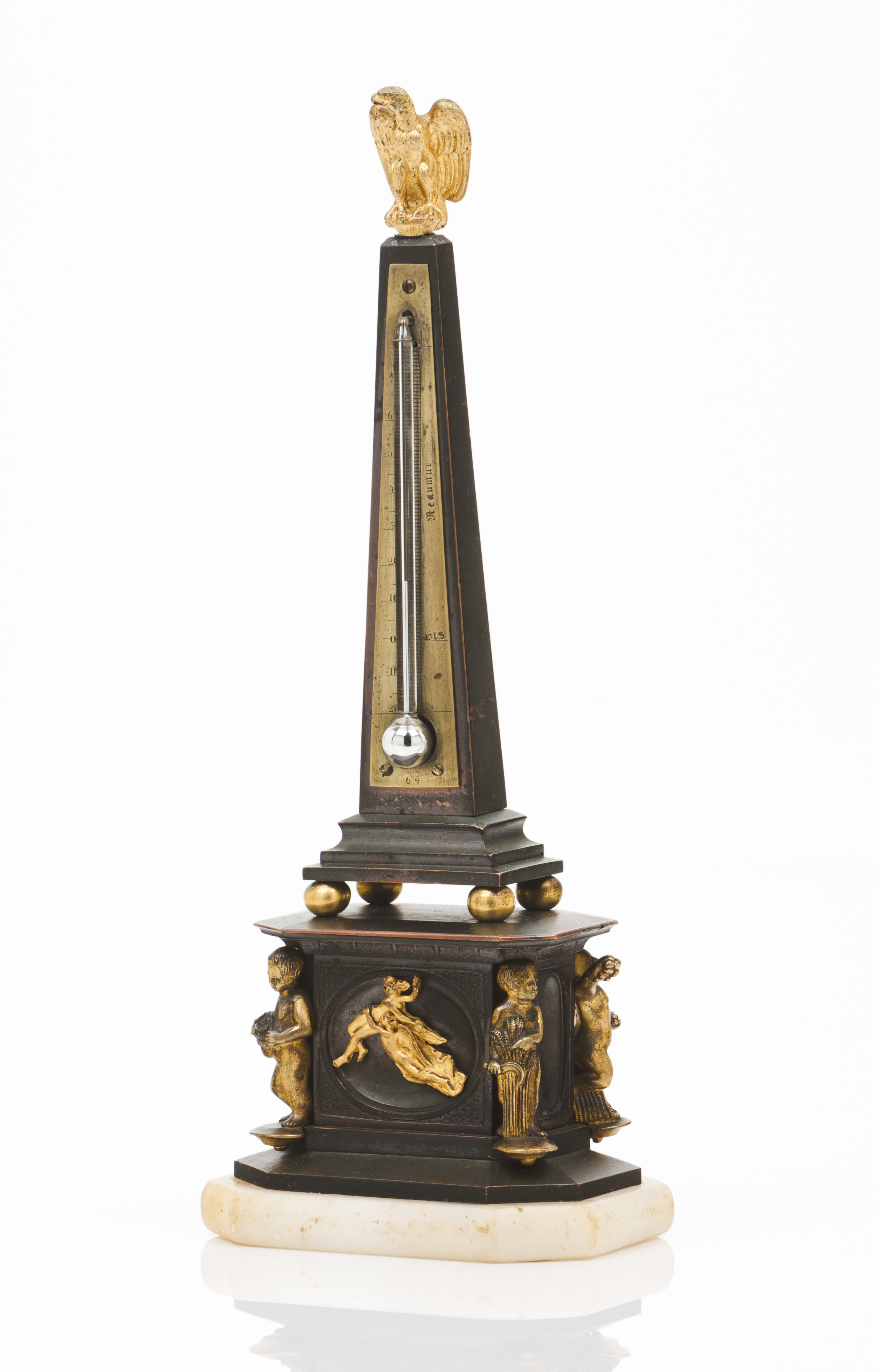 Obelisk shaped toped by eagle on a plinth decorated with putti and mythological figures reliefs