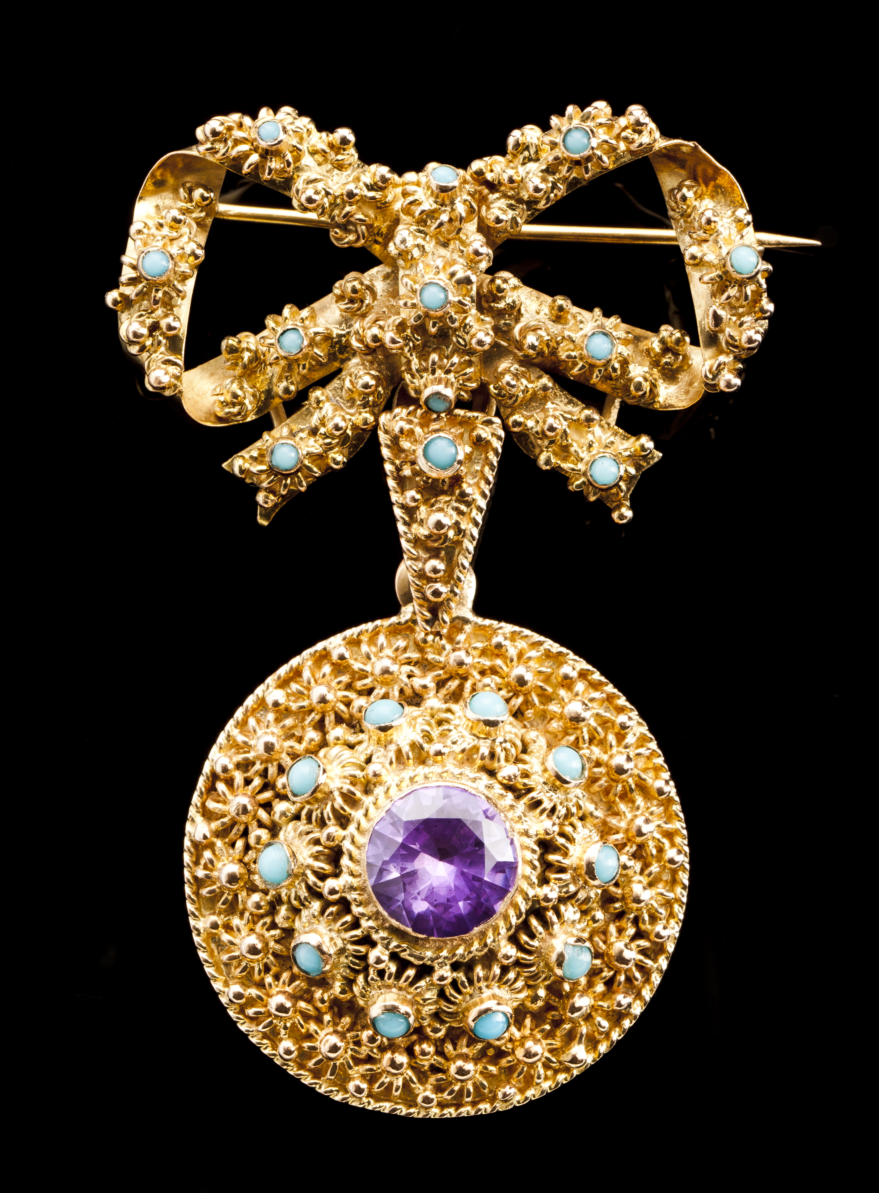 Designed as a bow with detachable round pendant, granulated and filigree decoration set with blue pastes and one brilliant cut amethyst