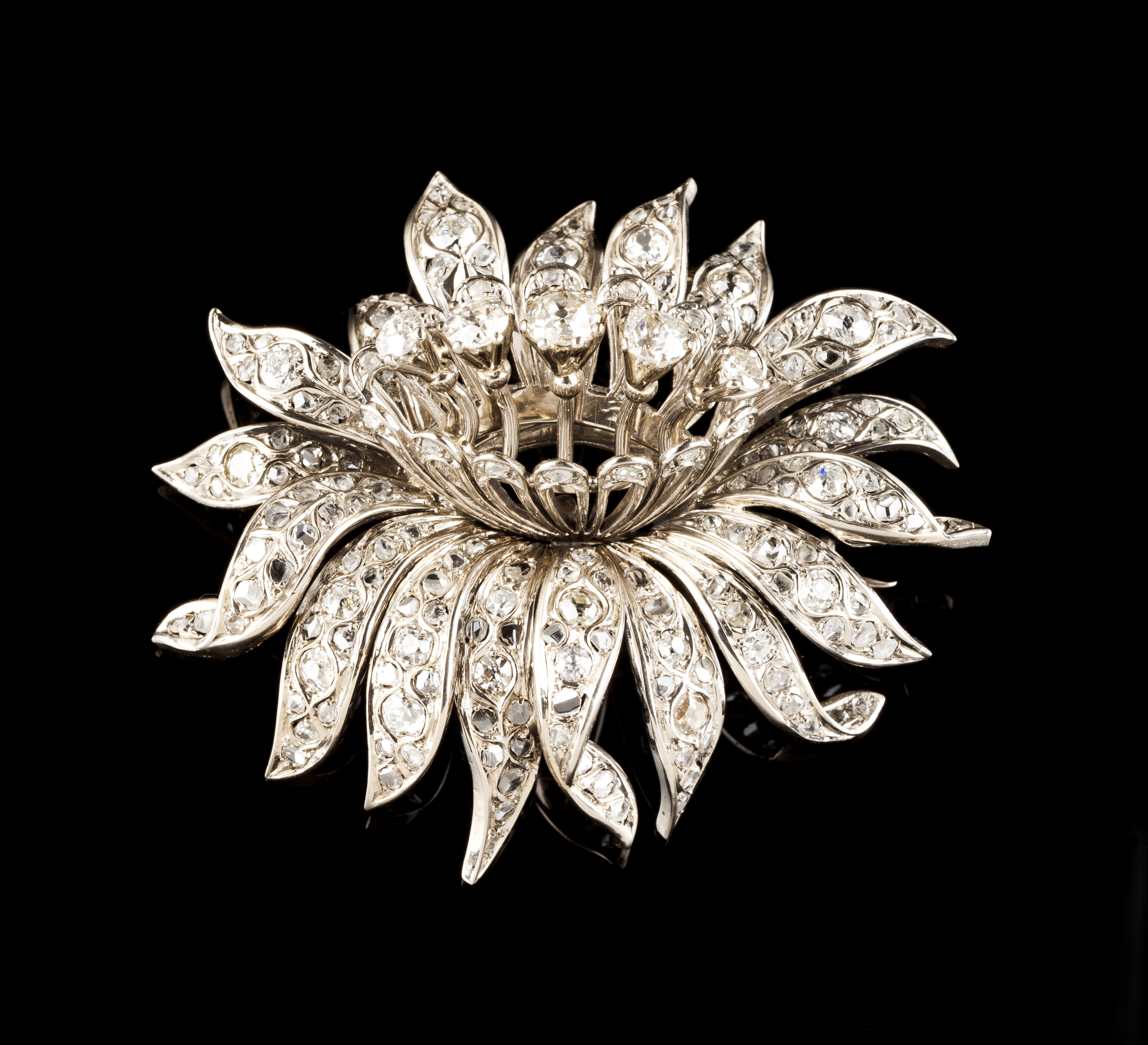 Set in white gold with rose cut diamonds and 26 old mine cut diamonds (ca. 3,60ct), designed as a flower