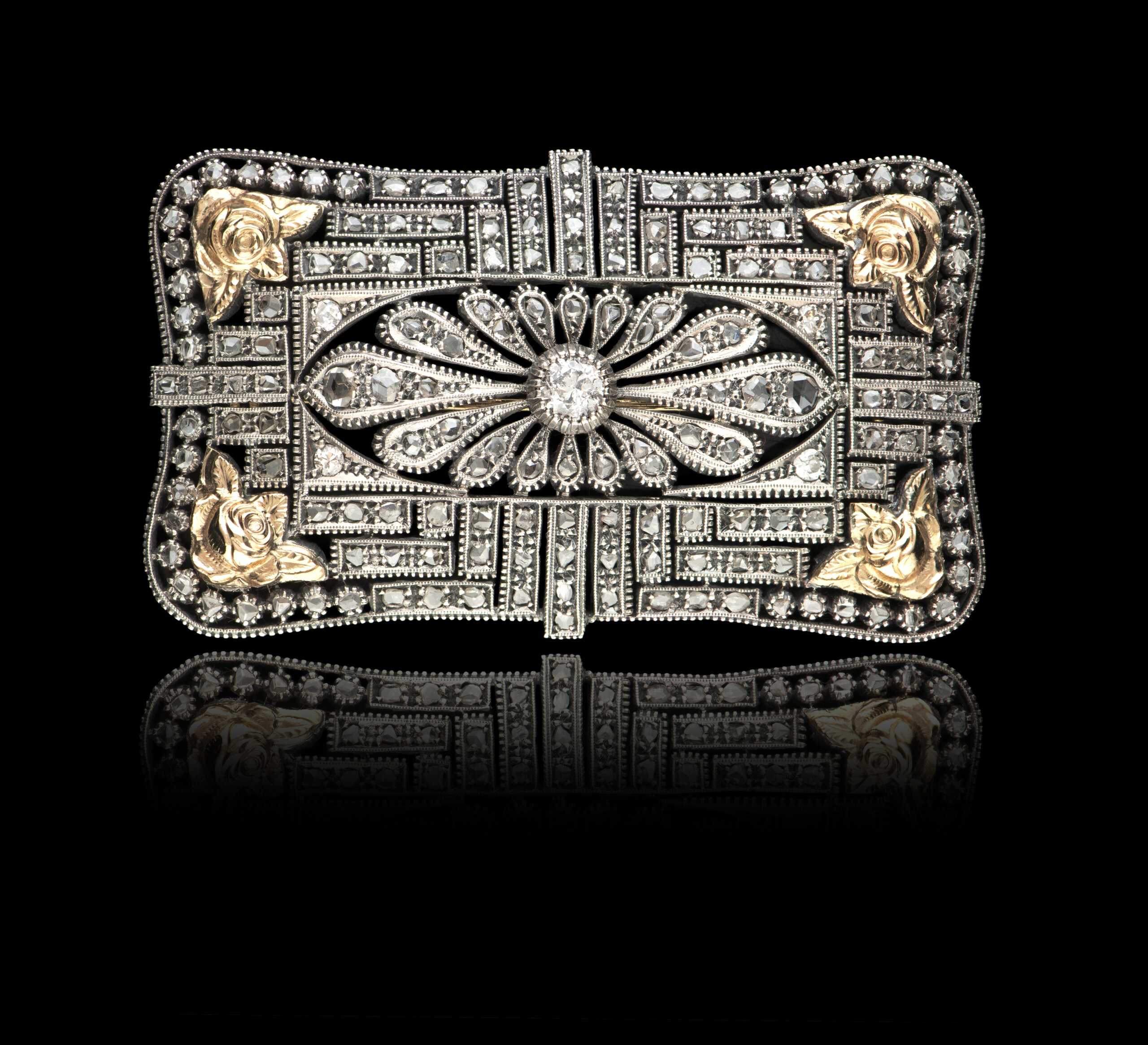 Set with rose-cut diamonds and 1 old-cut brilliant diamond weighing approximately 0.36 ct.