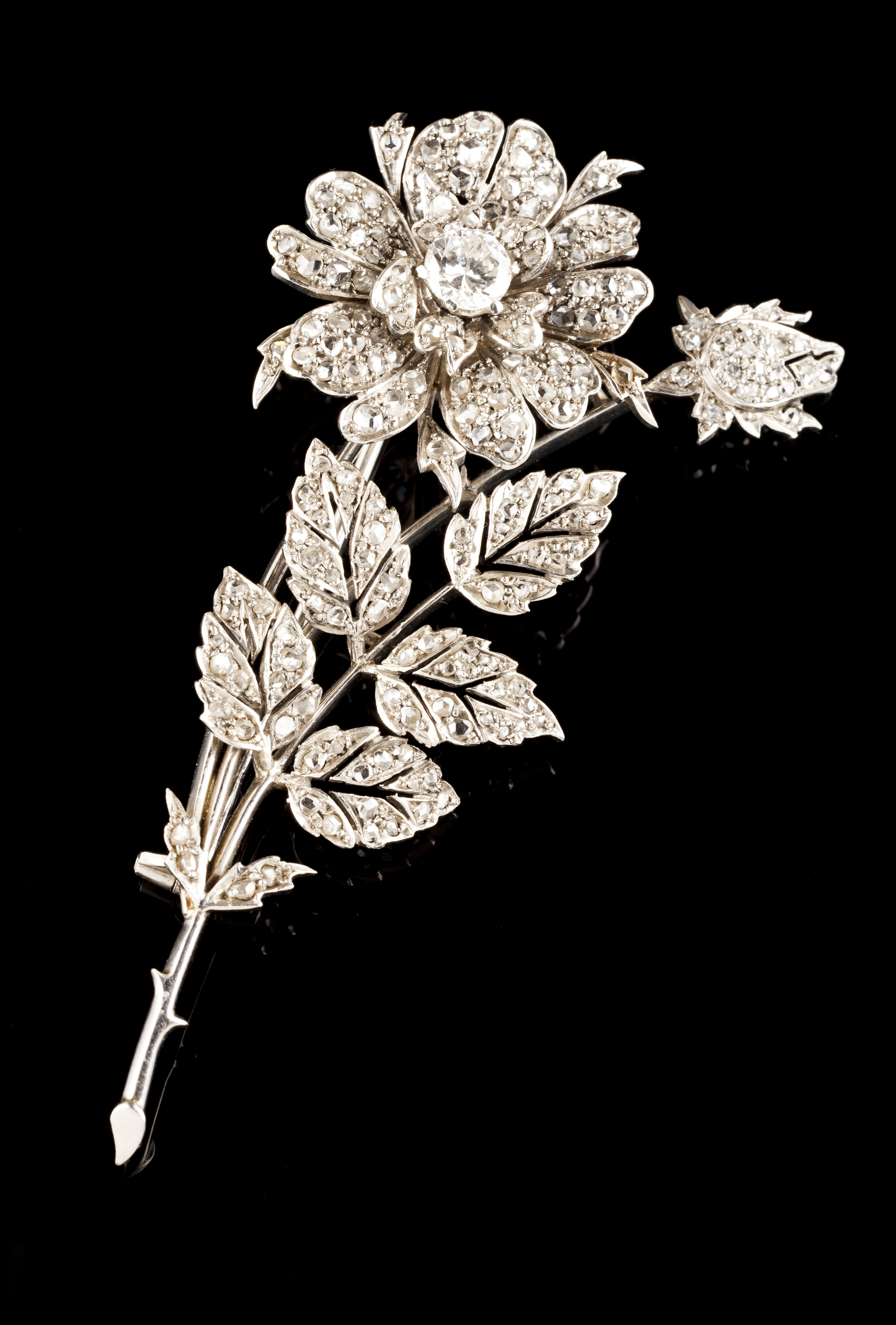 Platinum set with rose cut diamonds and one brilliant cut diamond (ca. 0,60ct)