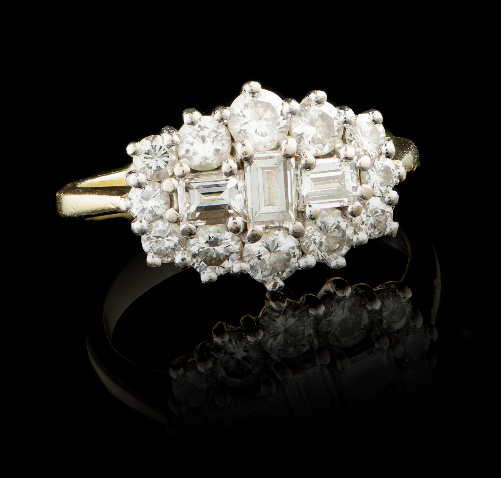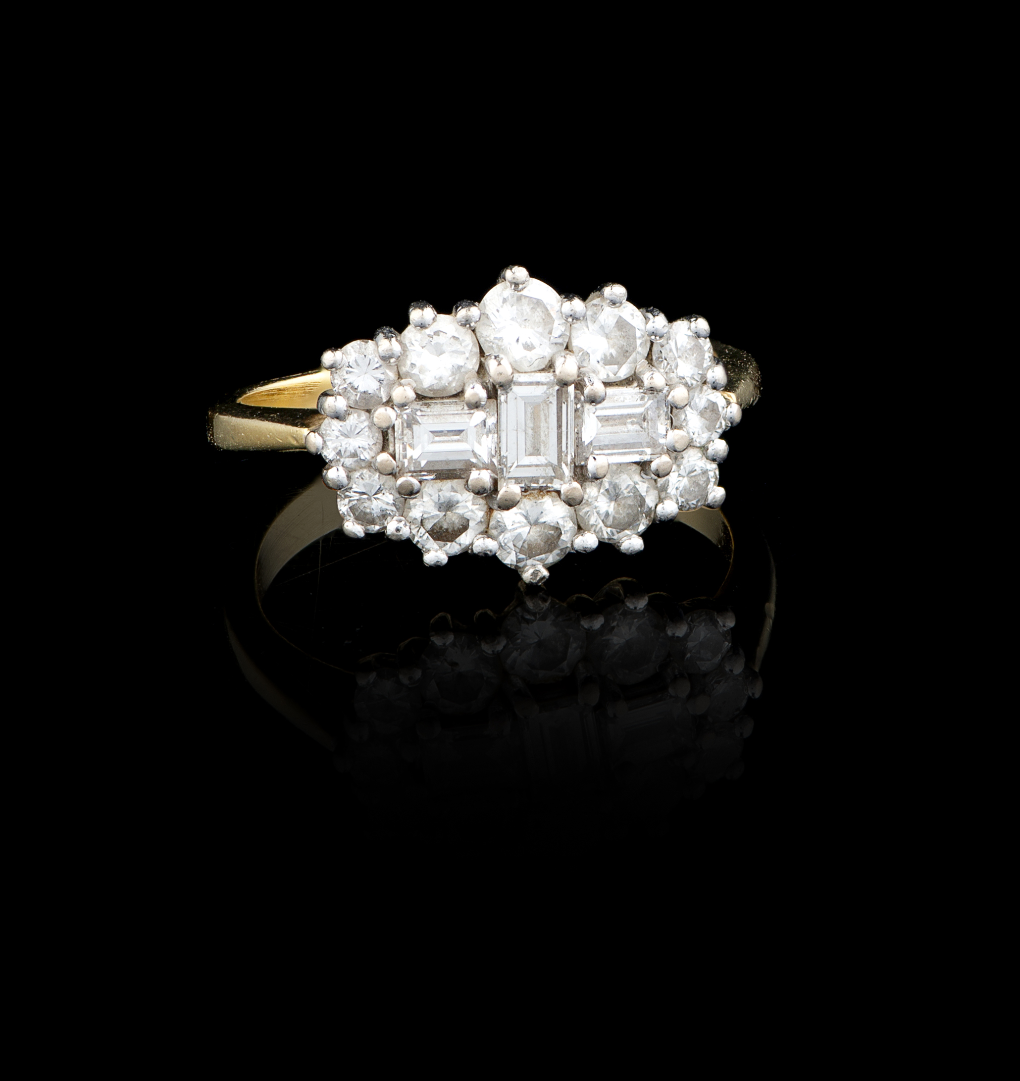 Set with 3 baguette-cut diamonds weighing approximately 0.80 ct. and 12 brilliant-cut diamonds weighing approximately 0.70 ct.