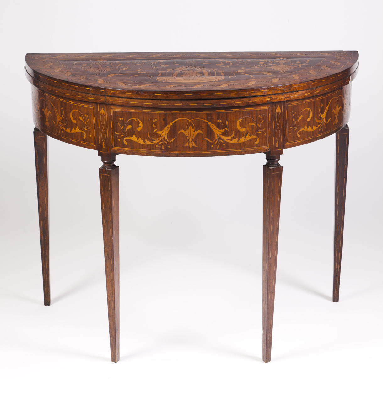 Rosewood, thornbush and other woods marquetry decoration representing friezes, scrolls, urns and fountain
