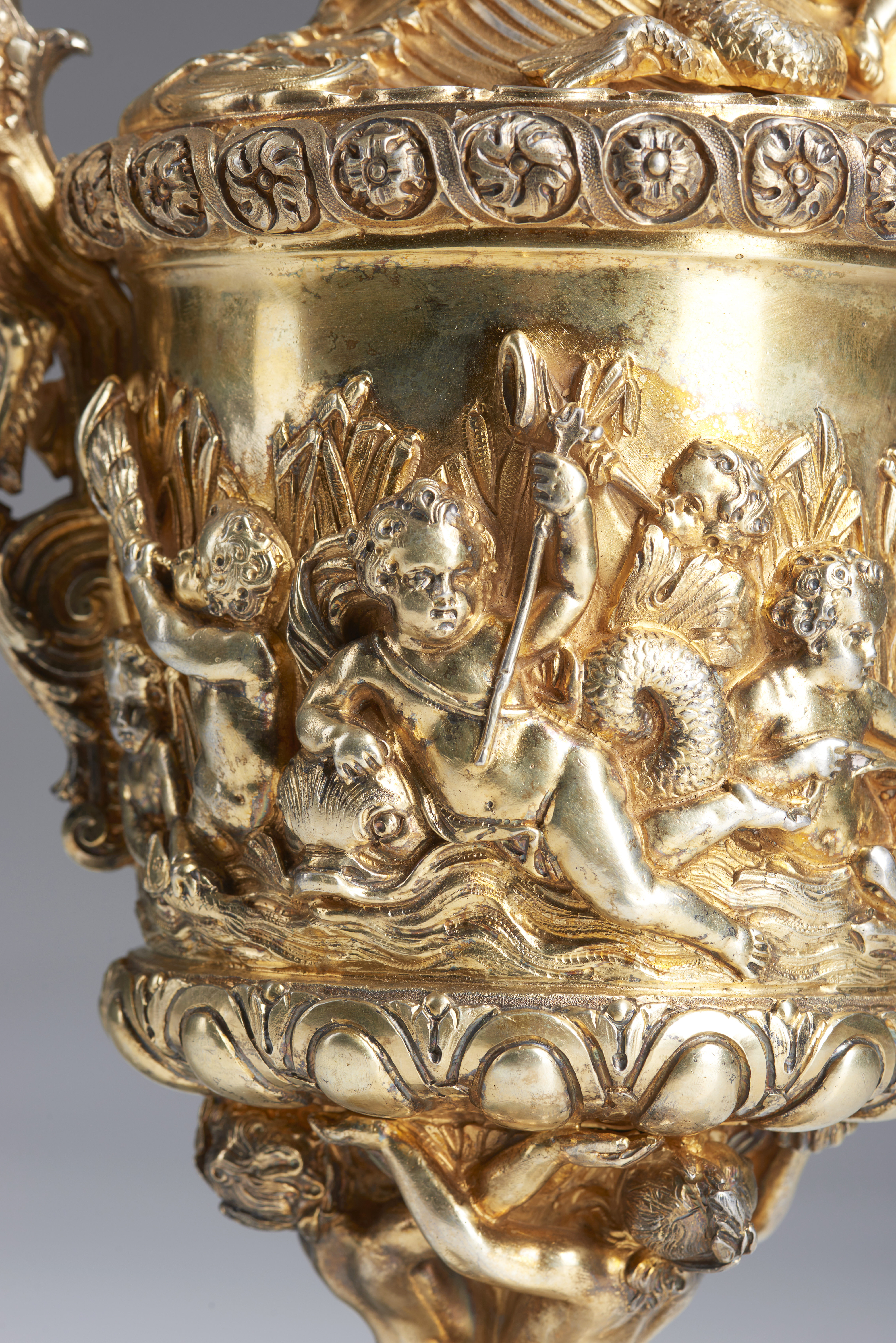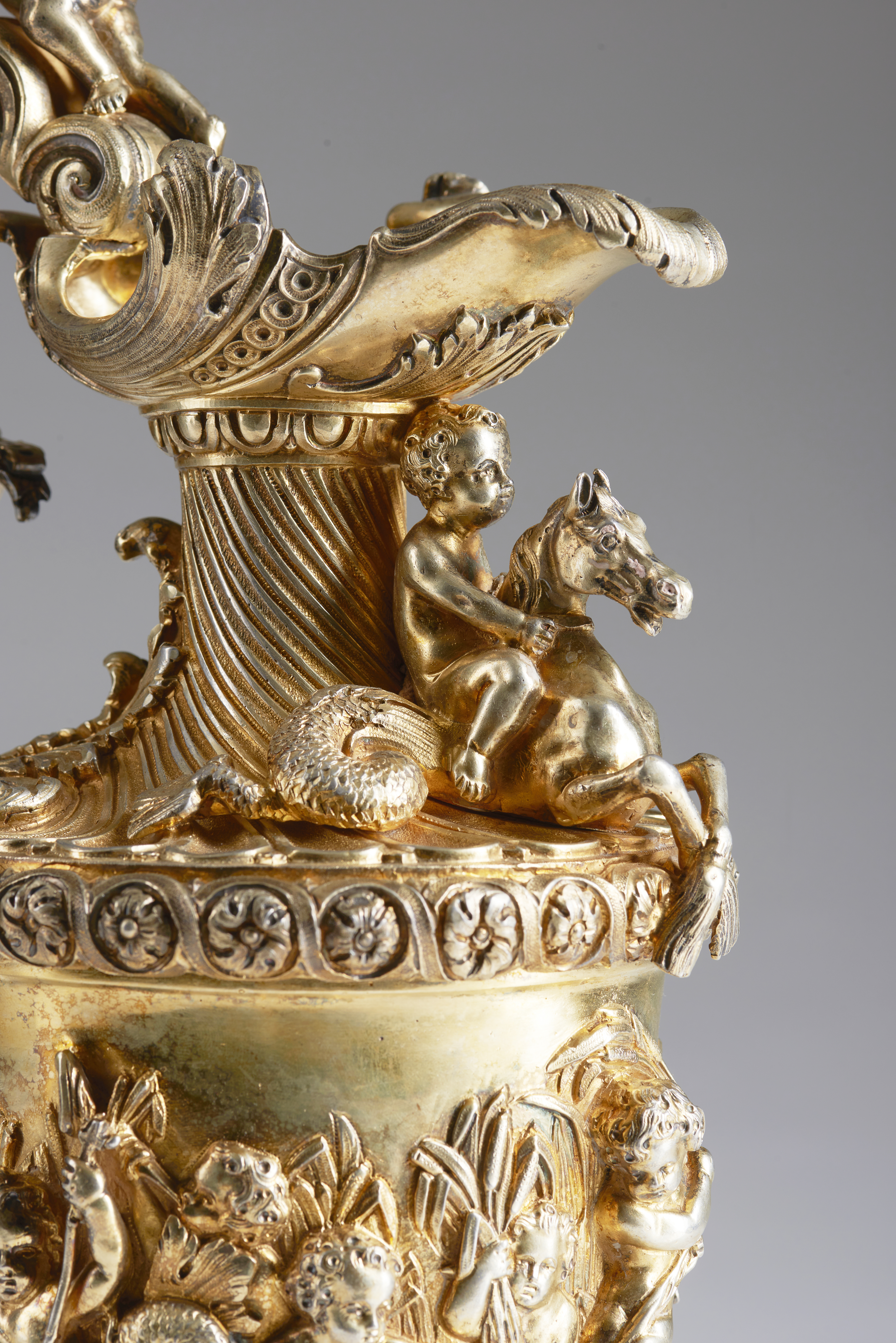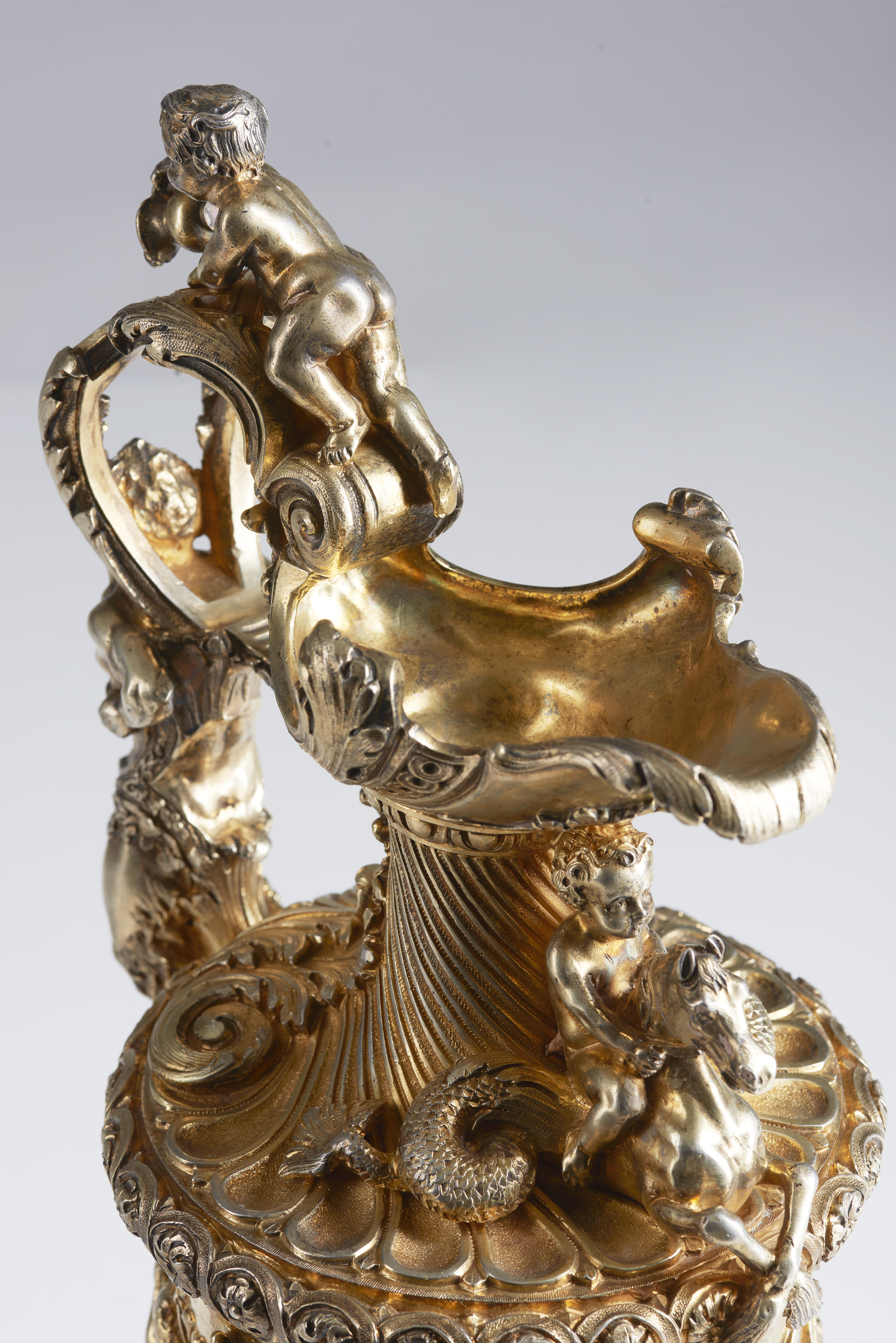 The body decorated with putti, dolphins and rococo motifs.