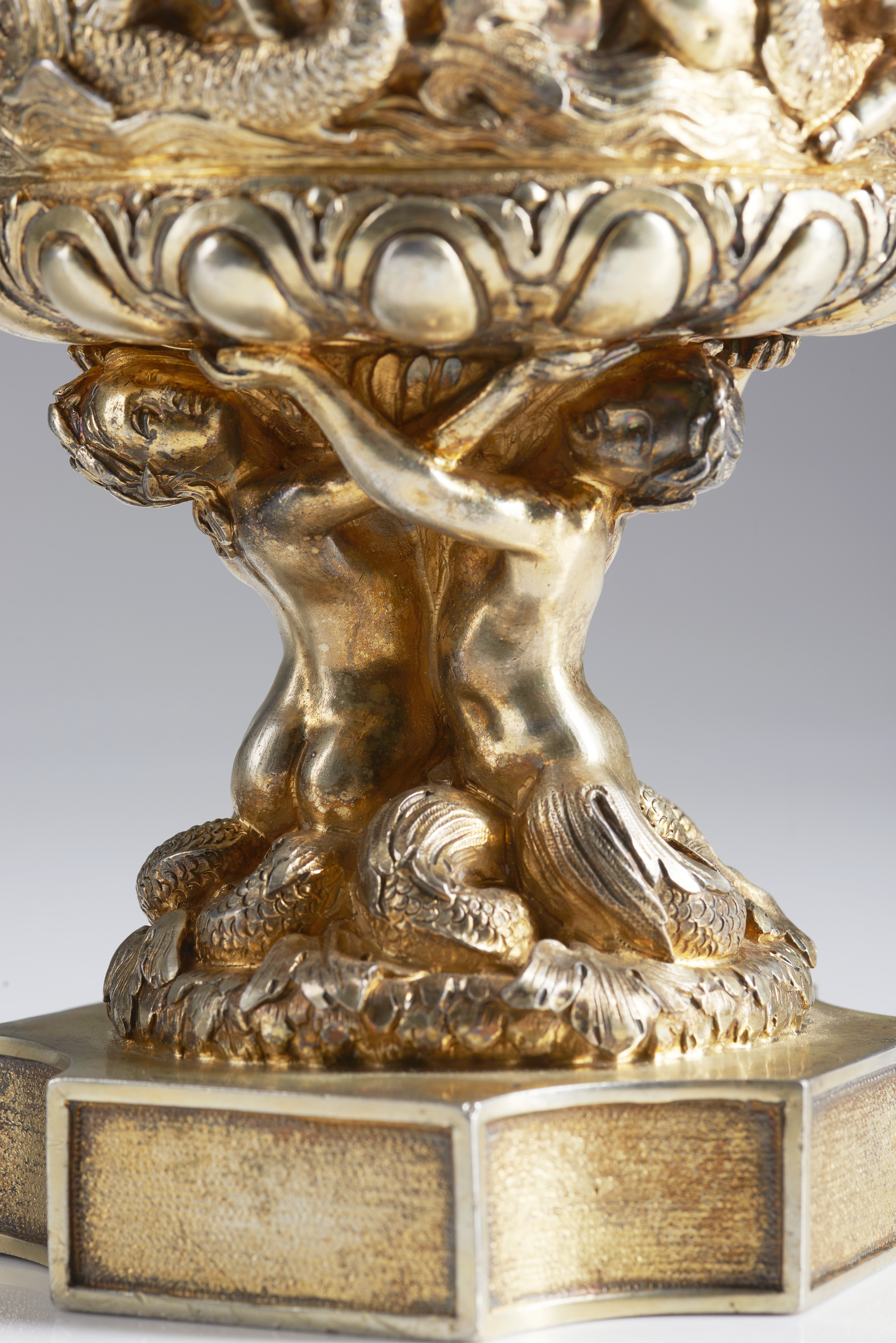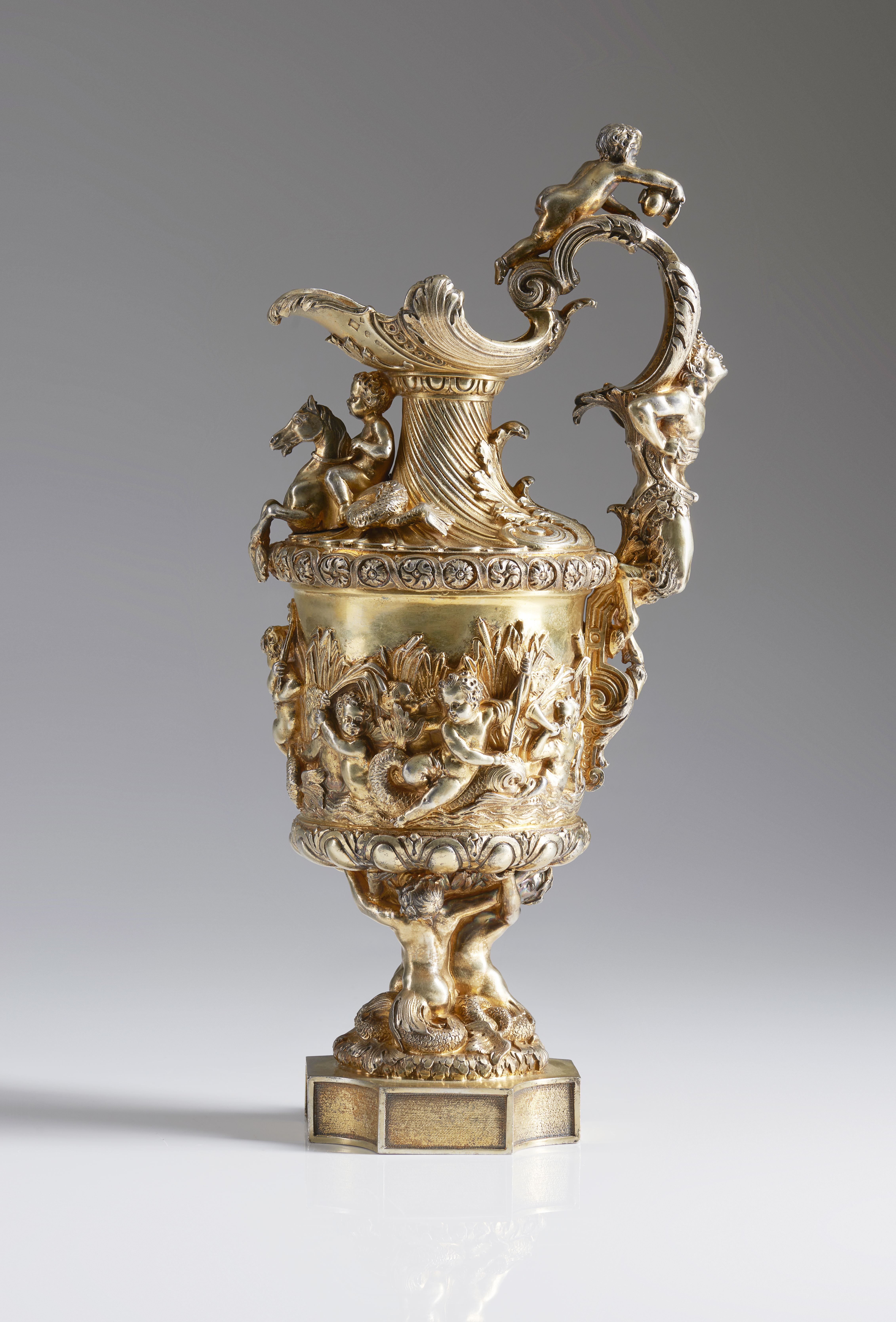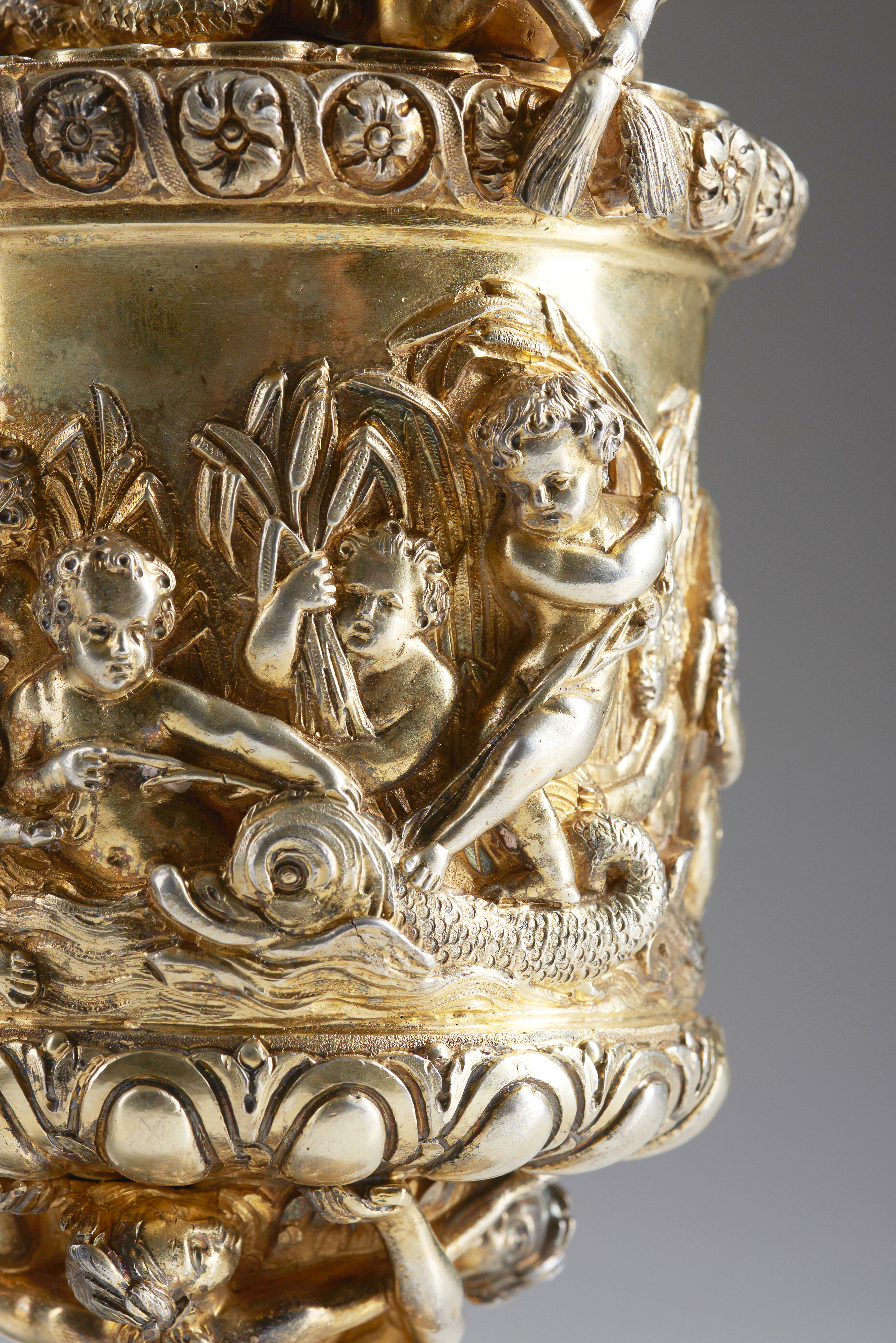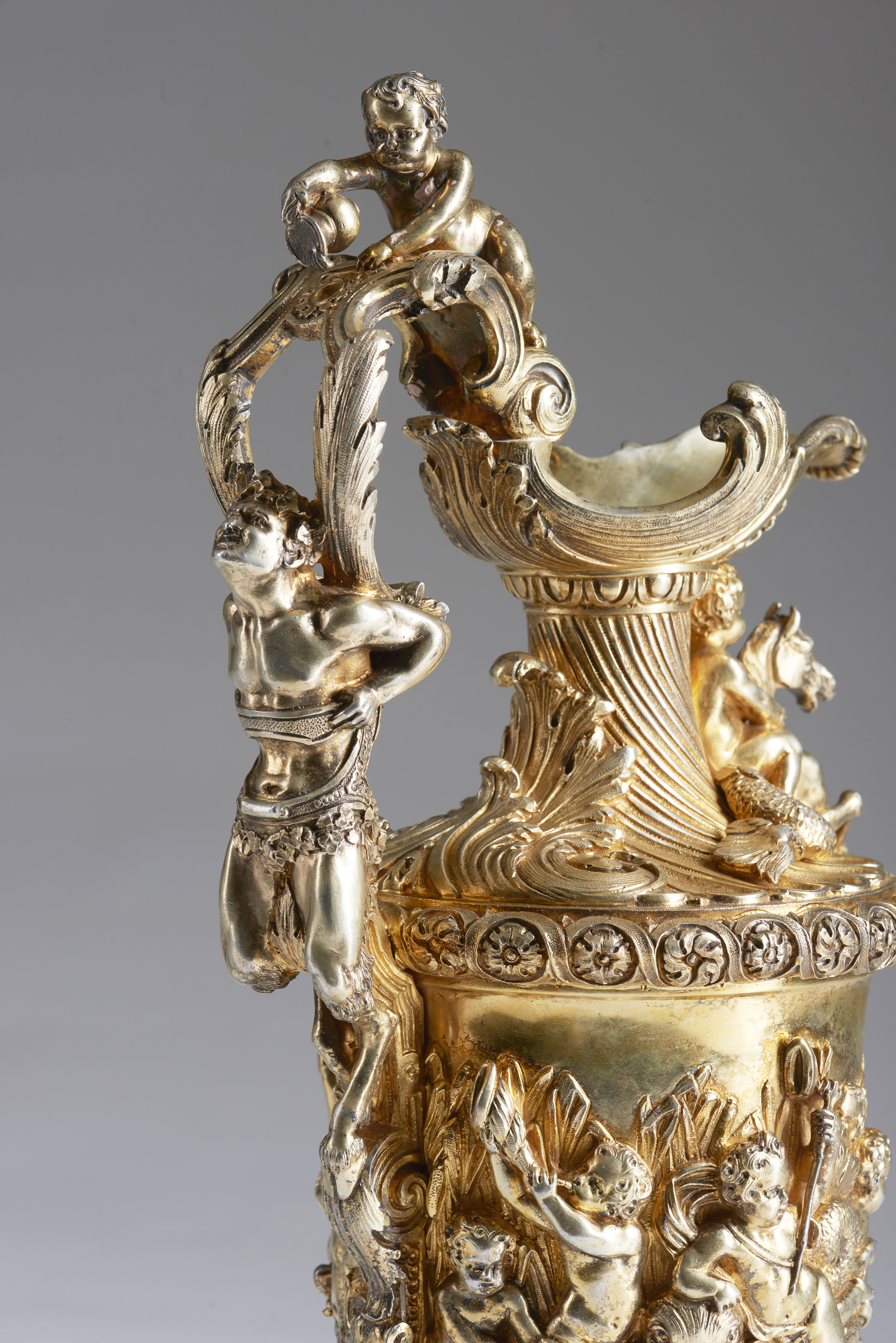The body decorated with putti, dolphins and rococo motifs.