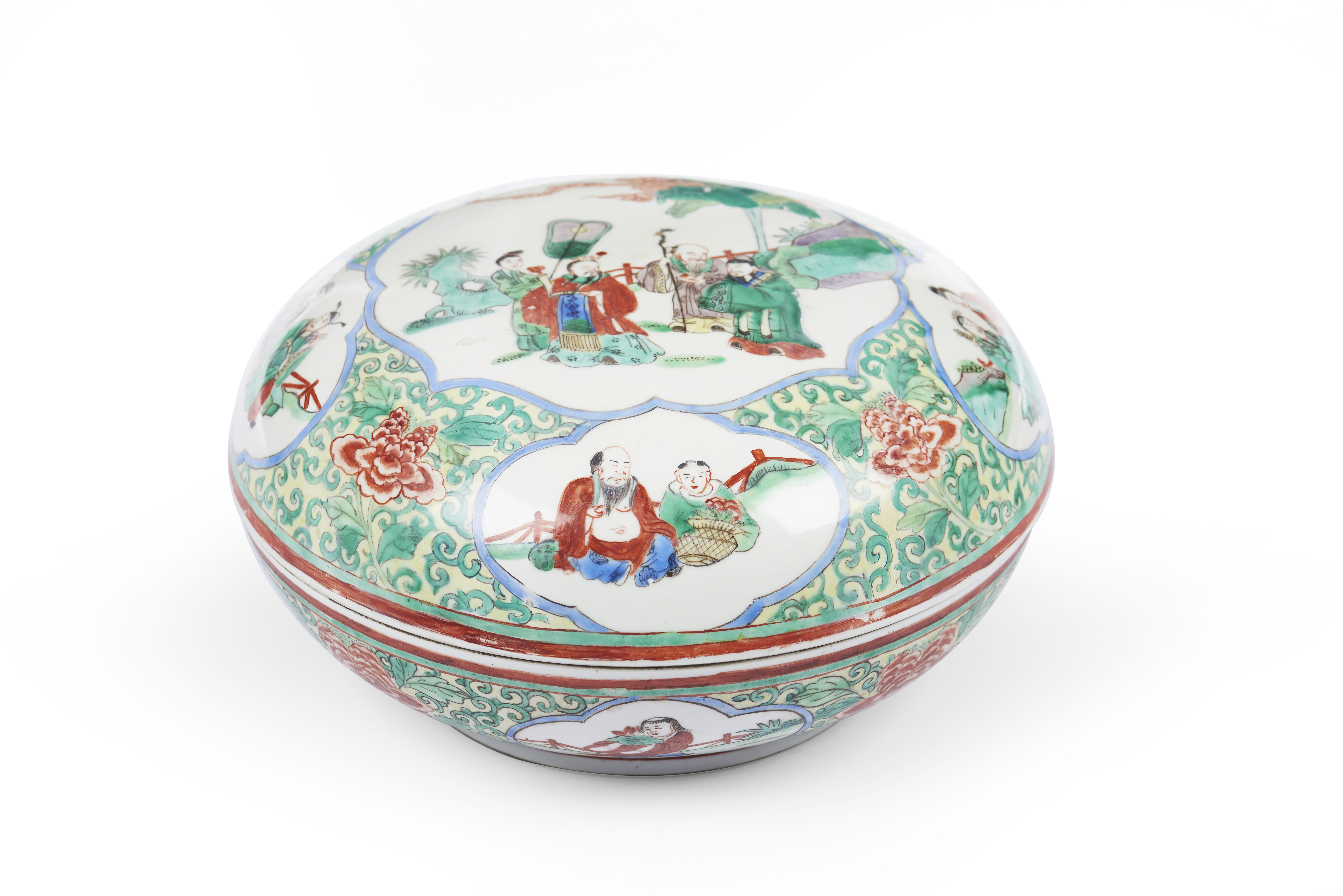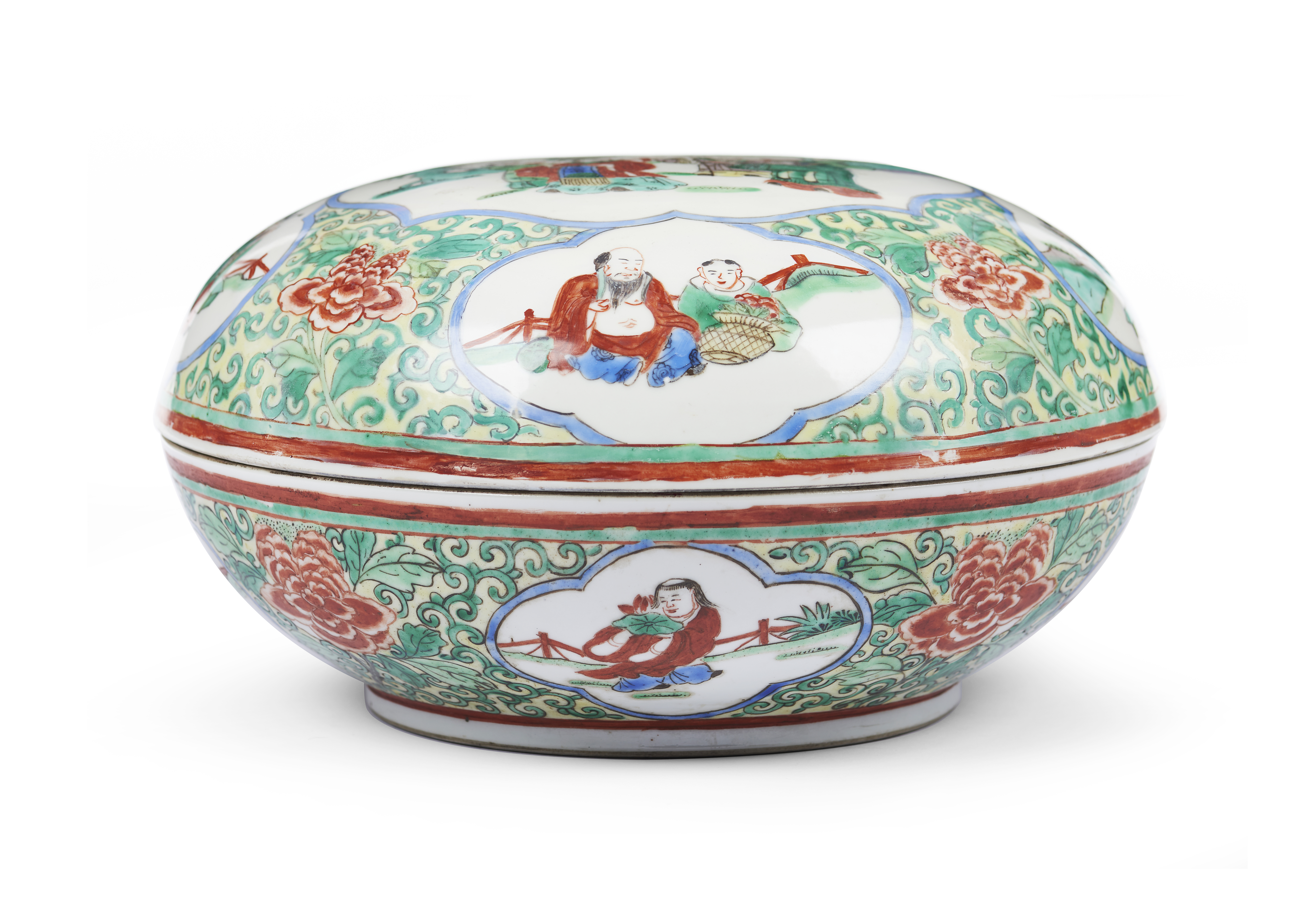 Painted with shaped panels enclosing garden scenes featuring the 'Daoist Immortals' on a ground decorated with peony scroll.
