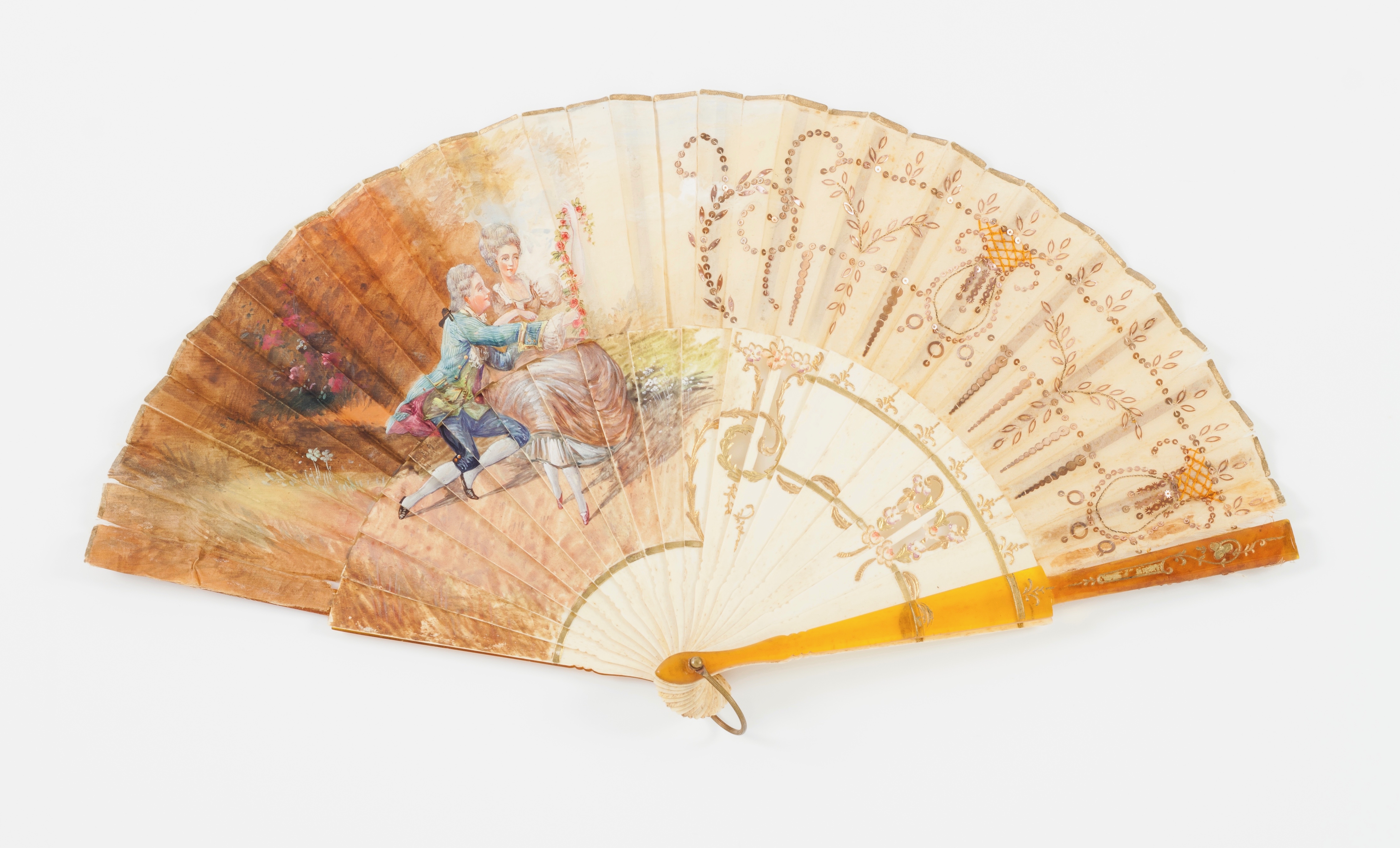 Fabric paper with polychrome decoration and sequins depicting gallant scene