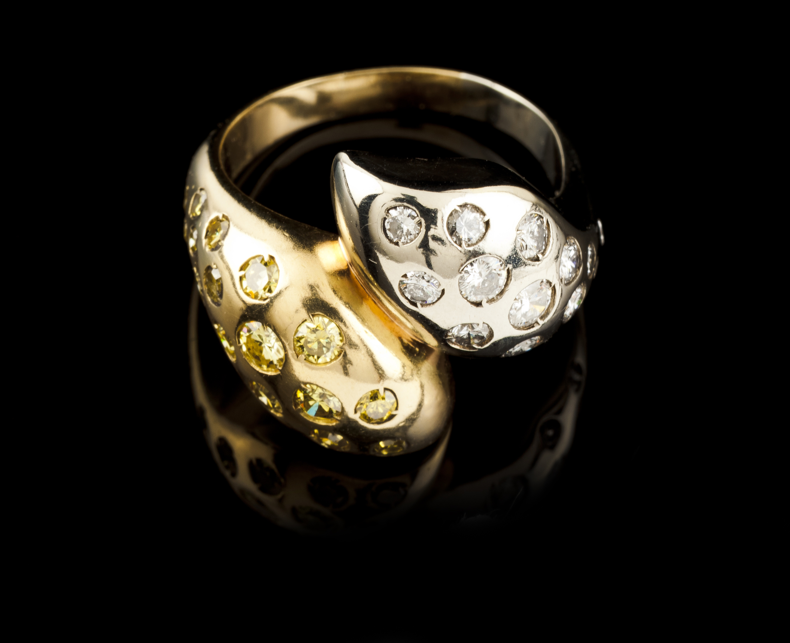 Two toned gold set with 16 near colorless brilliant and single cut diamonds (ca. 0,40ct) and 16 fancy yellow brilliant and single cut diamonds (ca. 0,40ct)