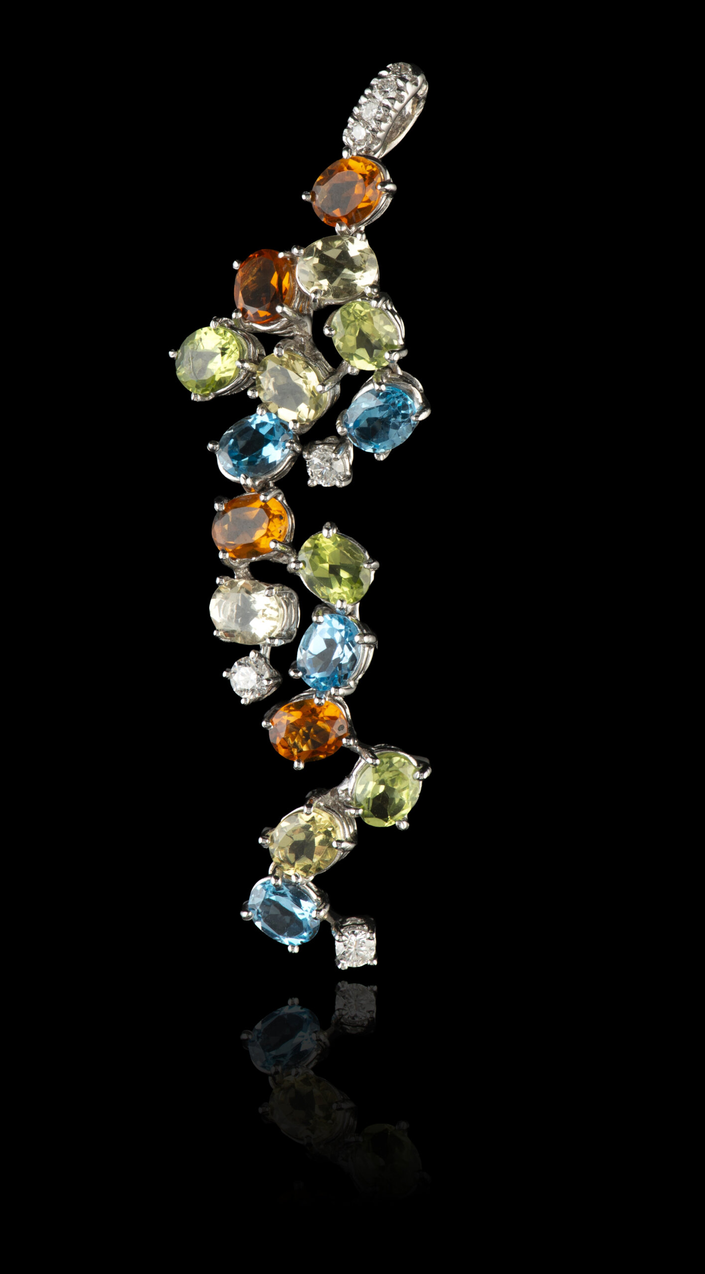 Set with 4 quartz, 4 tourmalines, 4 peridots, 4 topaz and 7 brilliant-cut diamonds weighing approximately 0.25 ct.