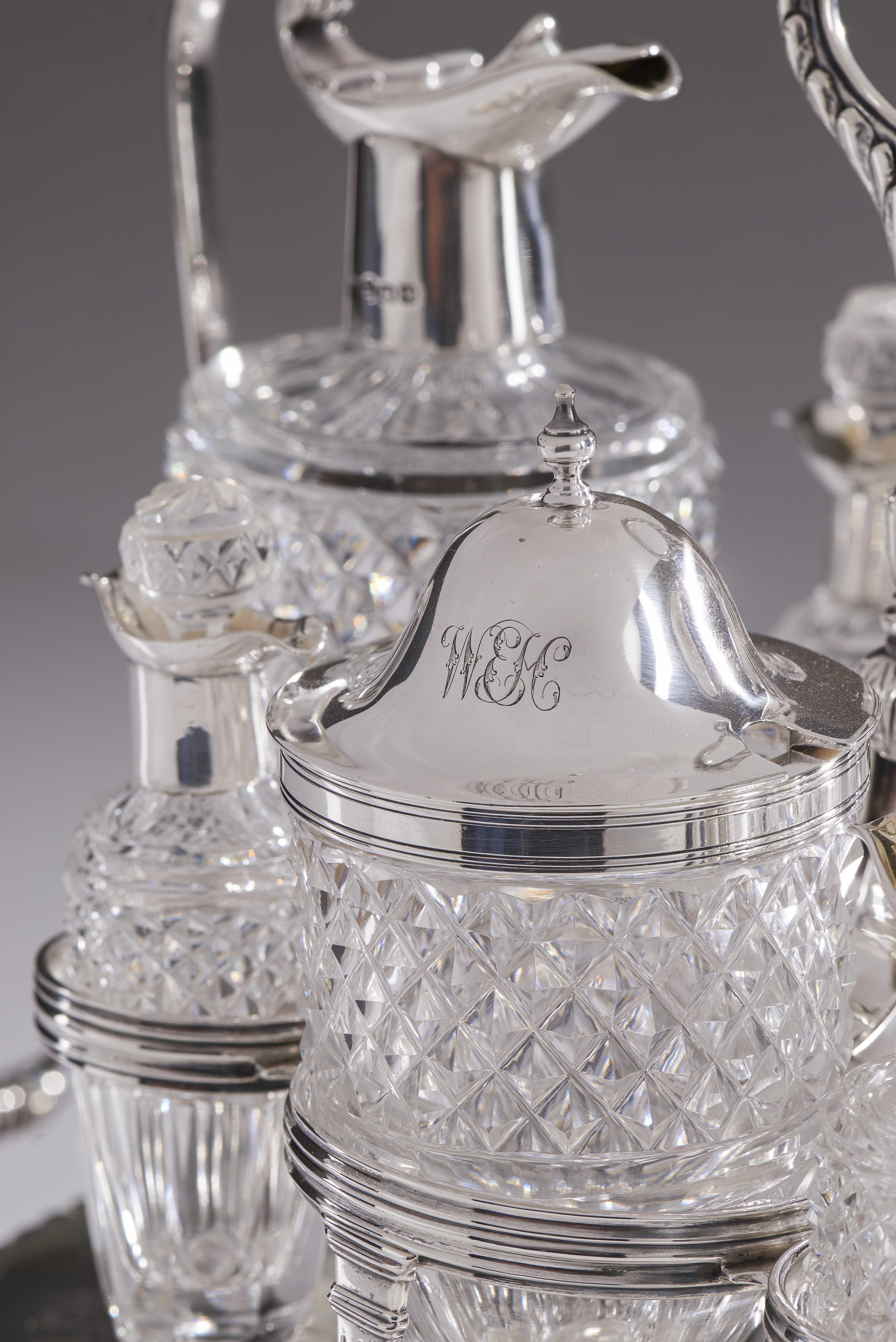 Comprising of two cruets, a mustard pot, a sprinkler and four faceted crystal jars