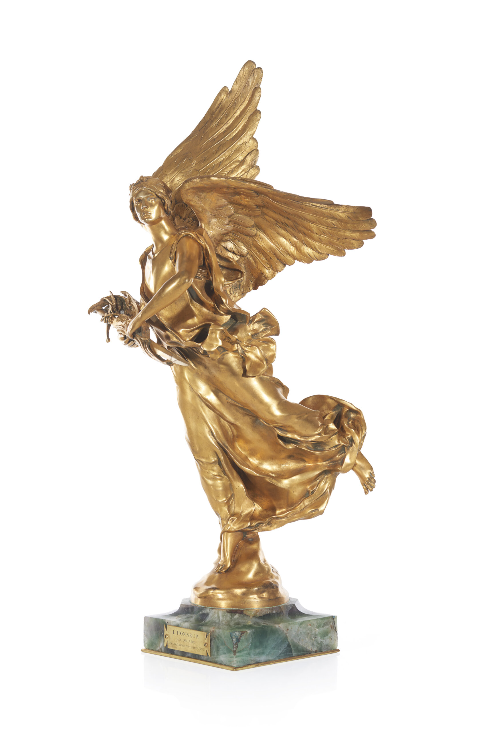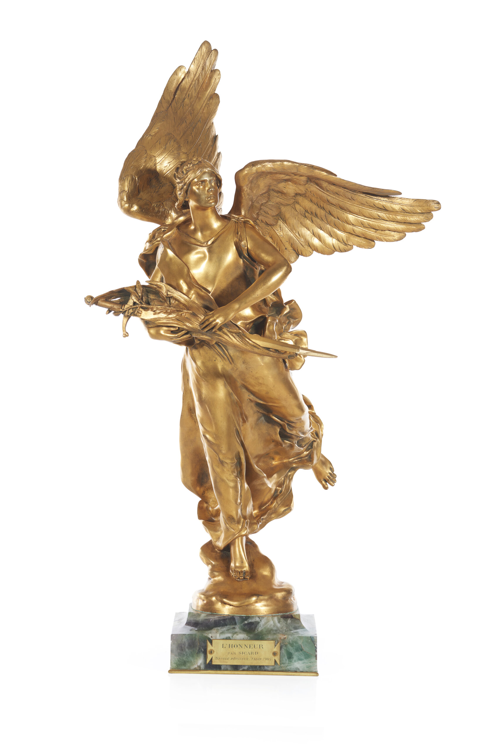 Gilt bronze sculpture, representing winged Victory, wearing a robe with ample folds, with torso turned and head raised, holding a sword horizontally