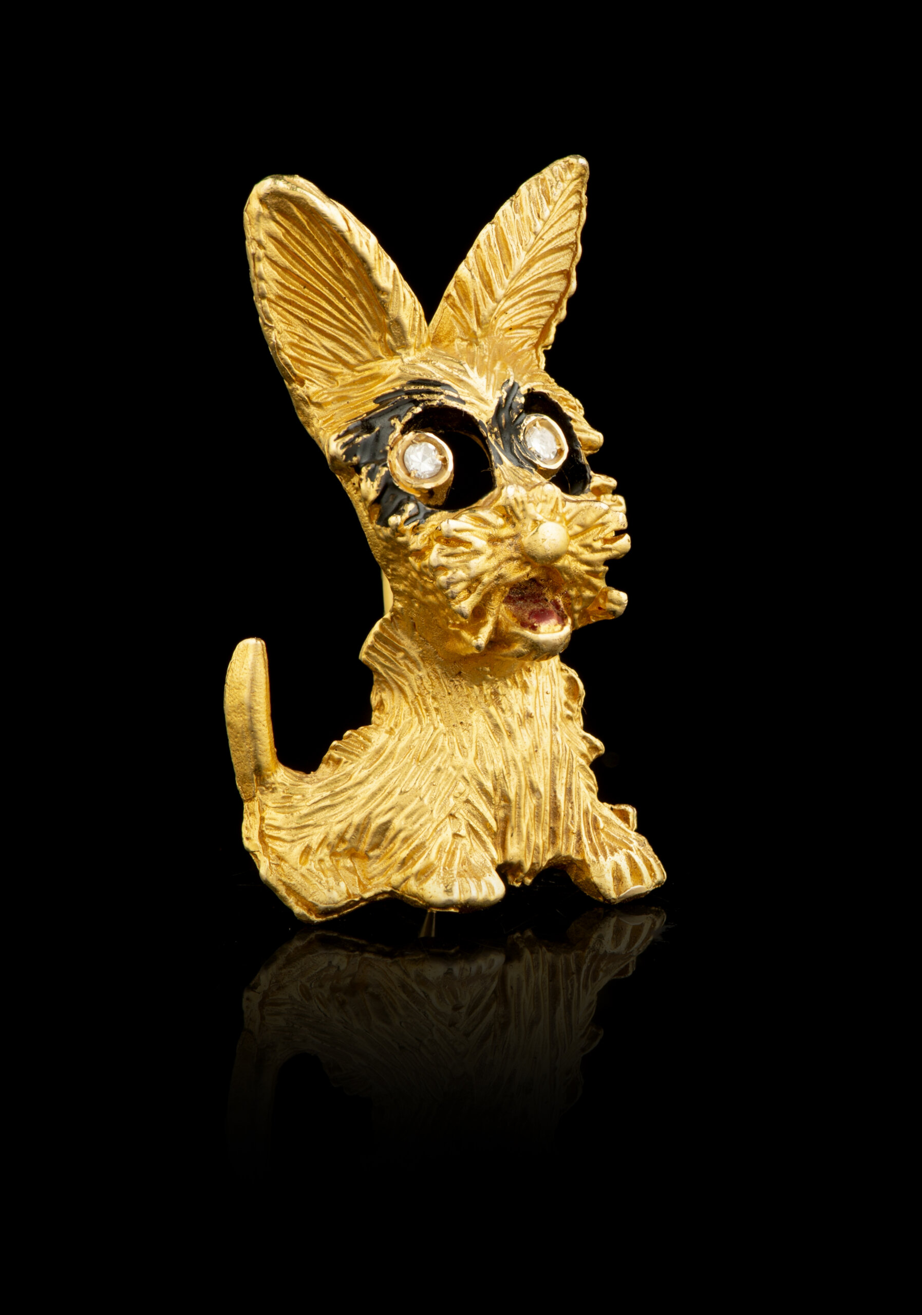 A gold, enamel and diamond dog brooch