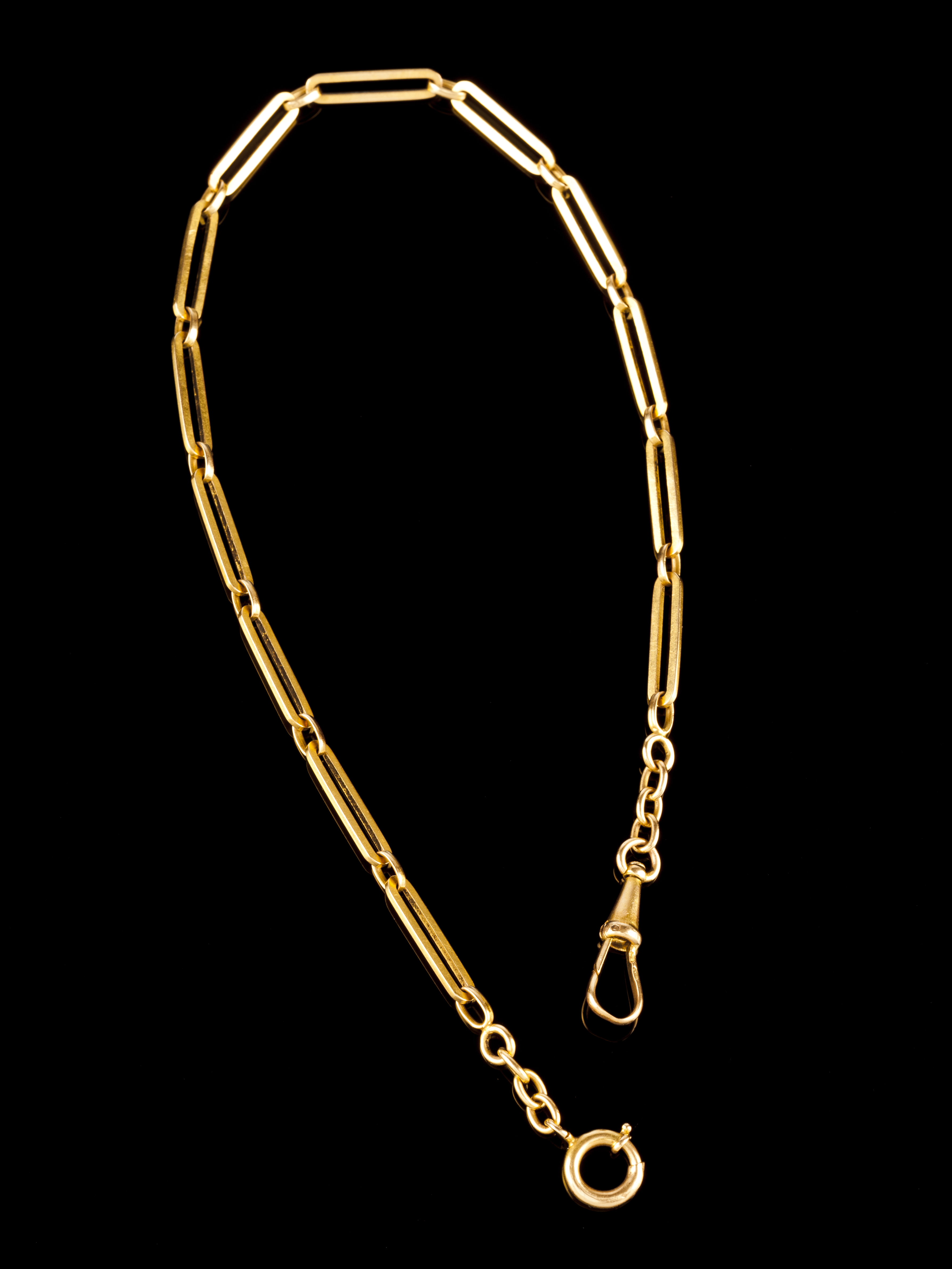 An (750/000)t gold gold pocket watch chain weighing 27cm lenght plus clasp