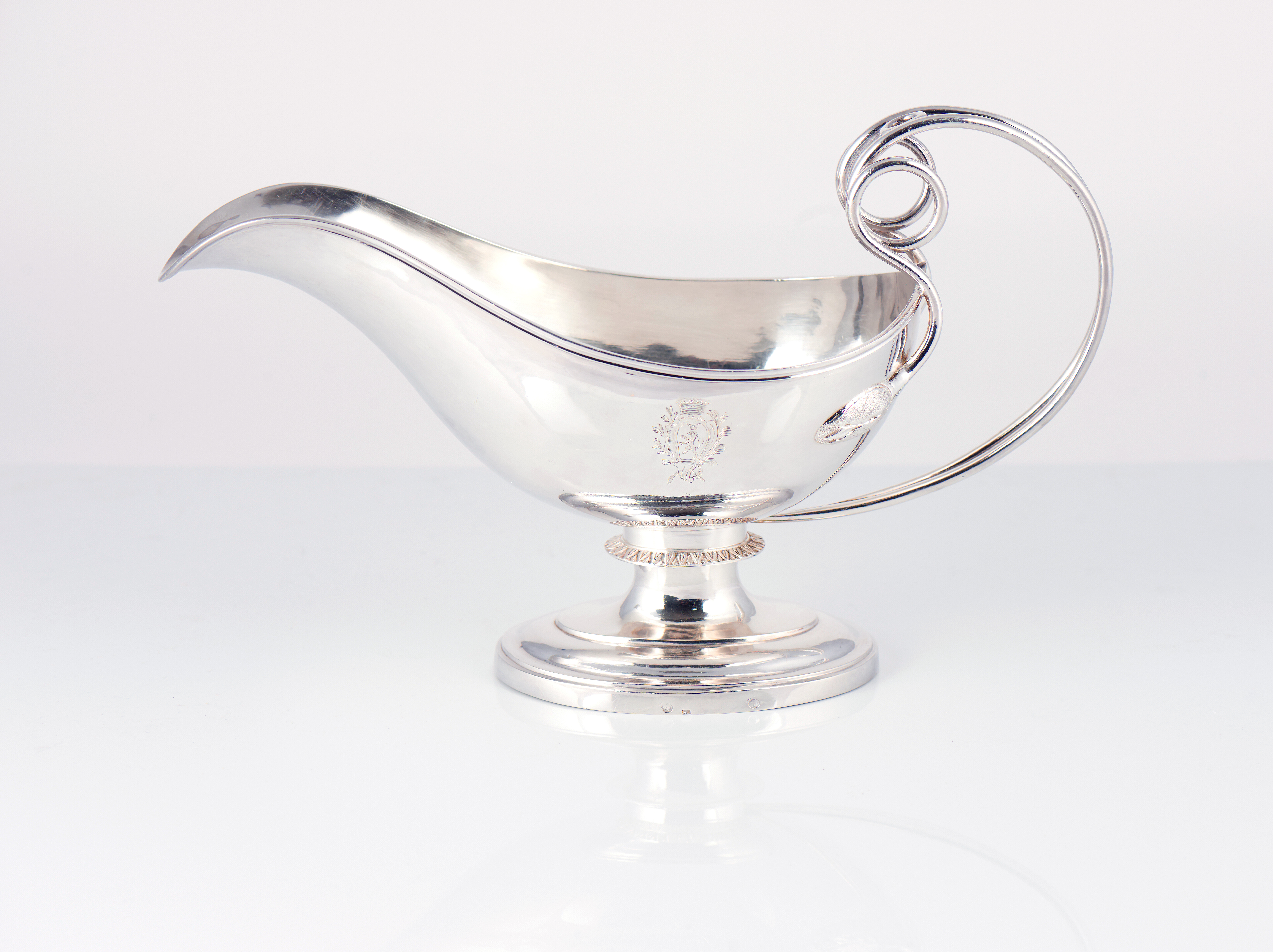 Rather strikingly, if this sauceboat recaptures the traditional forms od the Consulate style for its evident ornamental sobriety as well as for the purity of its lines, its foliage scroll handle, of considerable modernity, foreshadows rather clearly the Art Nouveau shapes and taste.