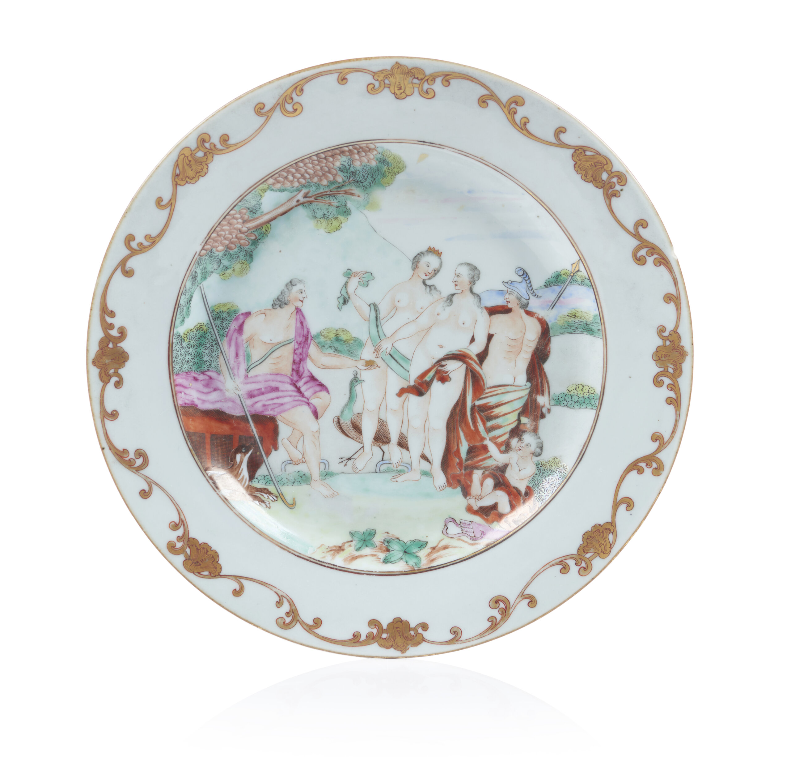 Chinese export porcelain with polychrome Famille Rose enamel decoration depicting a central mythological scene in which Paris shows the golden apple to the goddesses Hera, Athena and Aphrodite. Border decorated with gilt baroque surround. Qianlong period, c. 1750